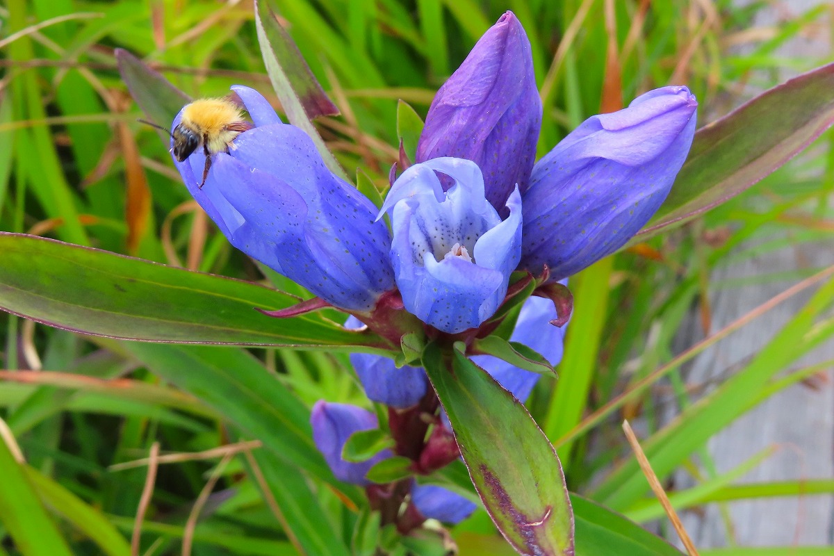 エゾリンドウの青紫色のお花からは、蜜を吸い終わったハナバチが出てきましたよ。