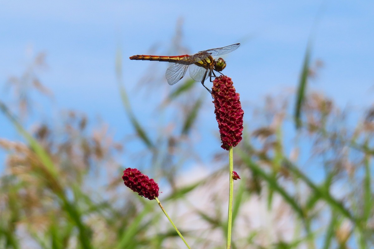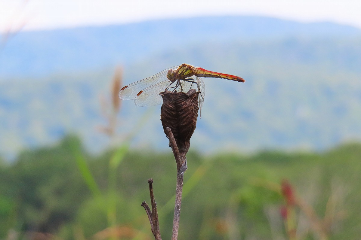 ミヤマワレモコウやニッコウキスゲの実の上では、トンボが静かに羽を休めていました。