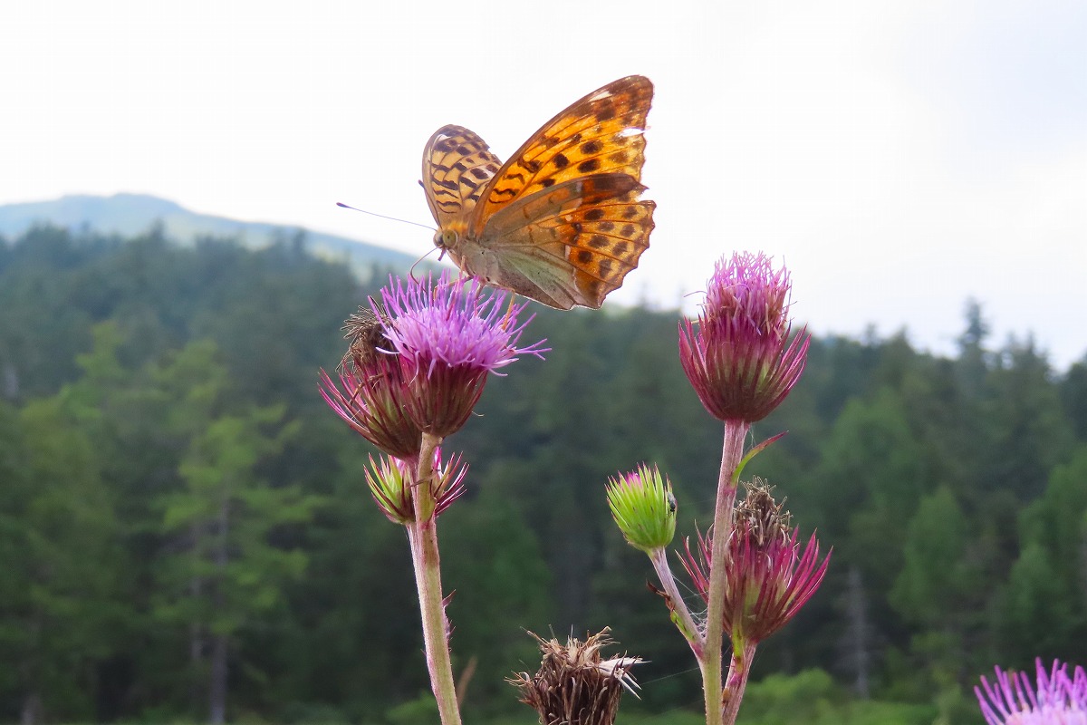 研究見本園中通りでは、終わりを迎えつつあるオゼヌマアザミの花に、ヒョウモンチョウが代わる代わる蜜を吸いにきていました。
