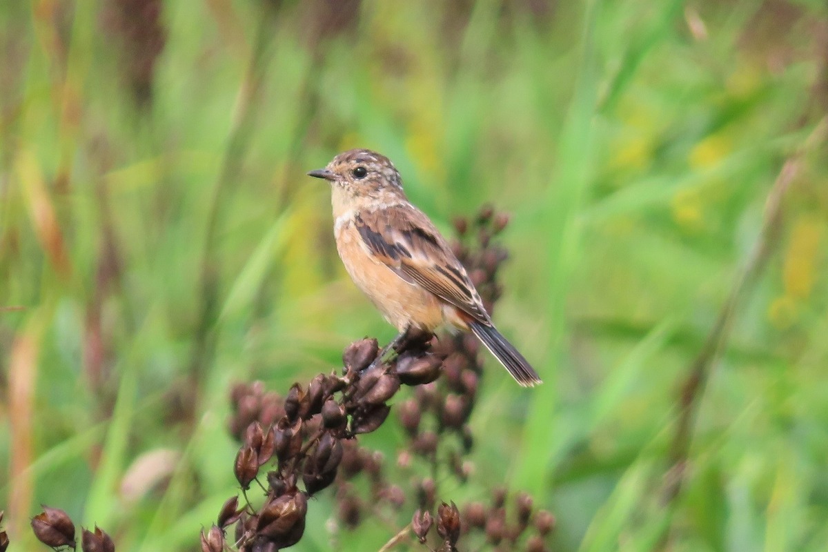 今年はお花の当たり年だったコバイケイソウの実の上で、鳥が静かに佇んでいました。ノビタキの幼鳥でしょうか。
