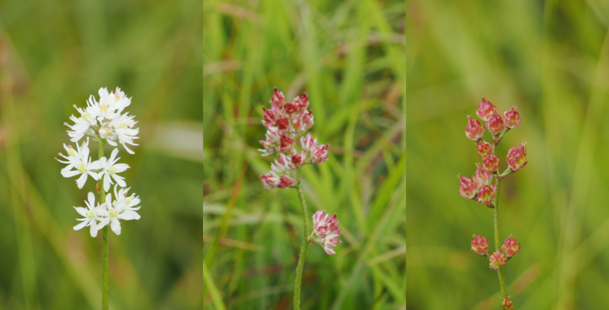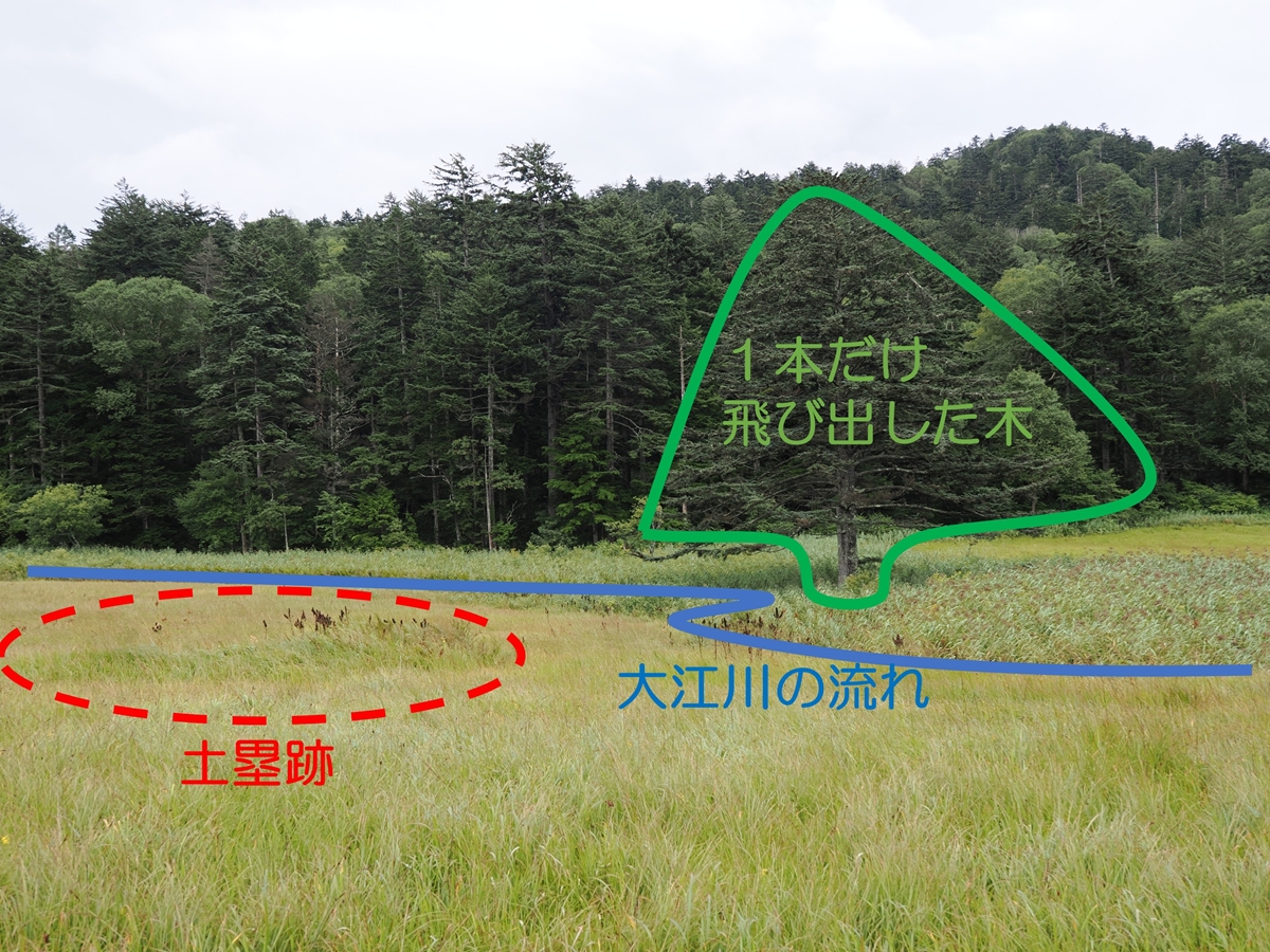 第二大江橋から沼山峠に向かい右を見ながら歩くとすぐ、森から1本だけ飛び出したような木が見えます。その木を正面に見て左手前、蛇行する大江川を挟んだ場所に数十cmほど盛り上がった夏草が見えます。上空から見ると三日月のような形なのですが、木道から見てもなんとなく湾曲しているのが見てとれると思います。今の時期だと黒い実をつけたコバイケイソウがアクセントになってさらに探しやすいと思います。皆さんもぜひ探してみてくださいね。