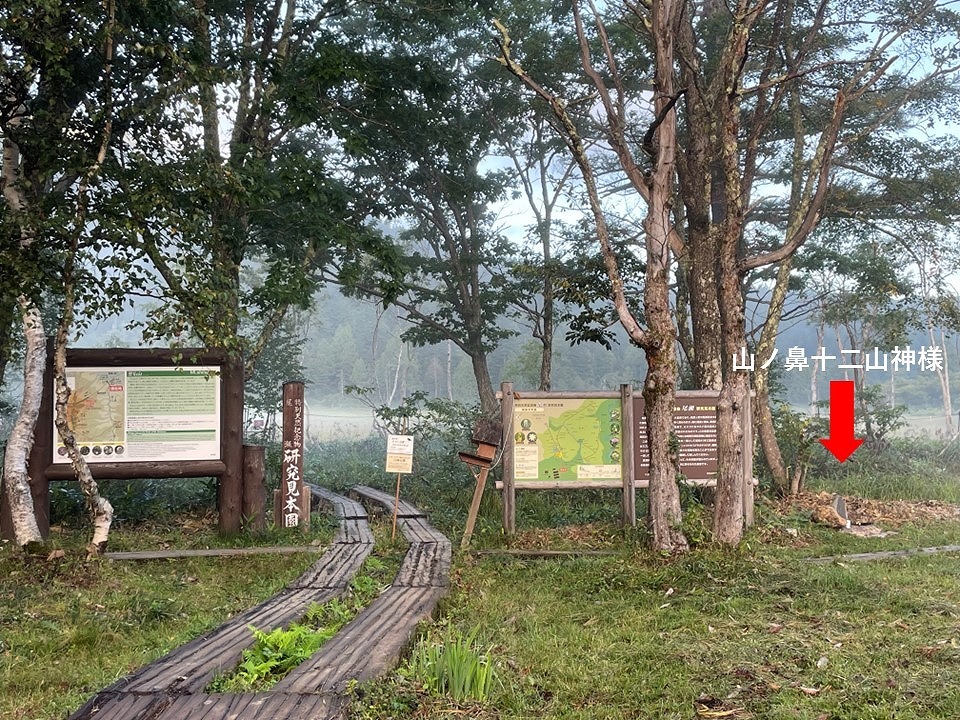山ノ鼻十二山神様は、研究見本園入口の赤矢印のところに鎮座しています。気づきにくい場所ですが、山神様の前に立つと木々の間を通して正面に至仏山が望めます。十二山神様とは、「十二様」「十二山ノ神」「十二神」など、各地で呼び方が違いますが、山の安全や恵みをもたらす守護神として、山に入って仕事をする人々から崇敬されています。一年の月数である12、あるいは子を12人産むとされる山の神の豊穣性や多産性から、12という数字が用いられると考えられています。