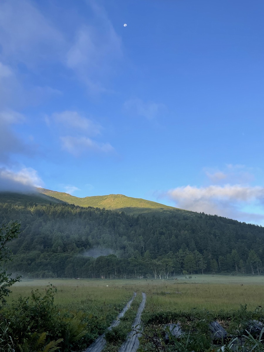 早朝の研究見本園では、青空が広がり至仏山の上に下弦の月がぽっかりと浮かんでいました。