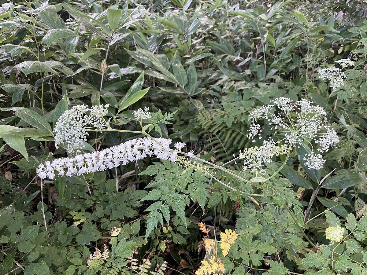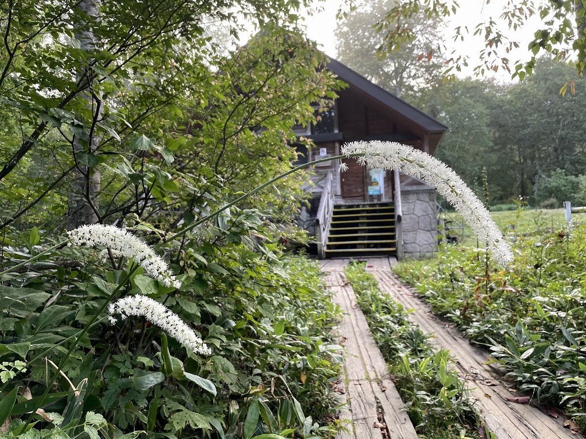 ビジターセンターの周辺で、サラシナショウマがたくさん咲いていています。人の背丈ほどもあり、白い20~30cmほどもあるブラシのような花をつけるのでよく目立ちます。
