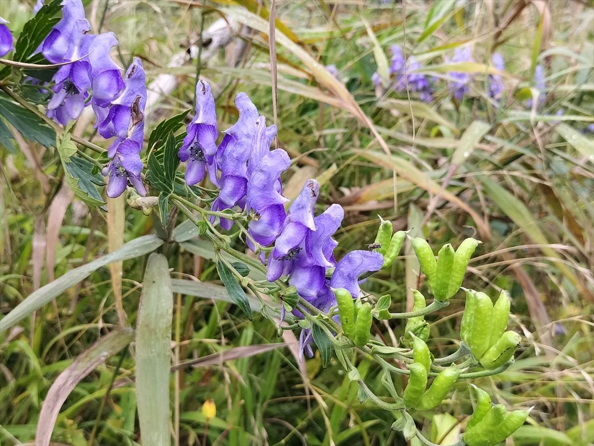 オクトリカブトは先端のほうから花が咲いていきますので、先端のほうはすでに実になっています。