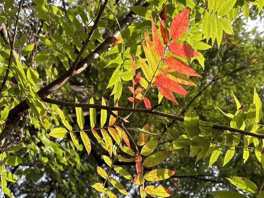 葉や実が赤く紅葉することで知られるナナカマド。真っ赤になっている様子は見事ですが、写真のように緑色から赤色へとグラデーションになっているのも、とても美しいです。