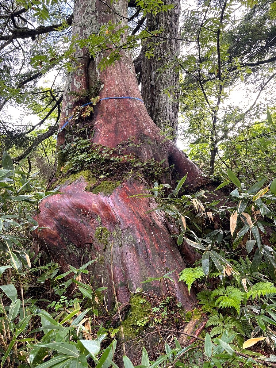 赤みを帯びた幹をもつのはクロベ(別名:ネズコ)で、ヒノキの仲間です。雨で濡れると、赤い色が際立ちます。