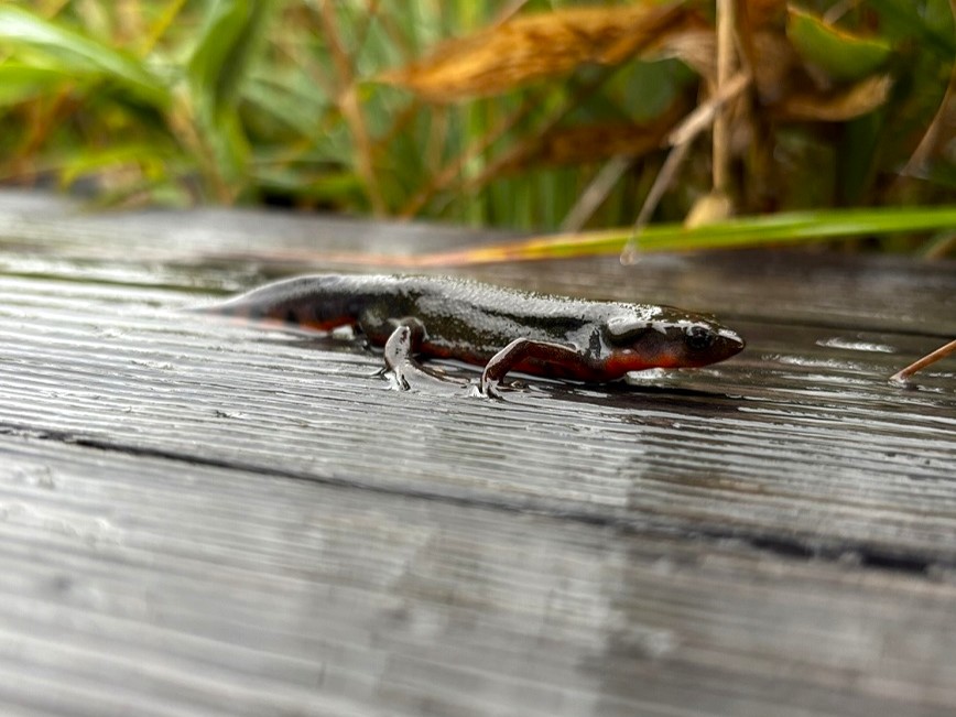 本来、池塘の中にいるアカハライモリですが、雨が降っていたためか木道上にいました。木道にいたので、お腹の赤い色がちらっと見えました。