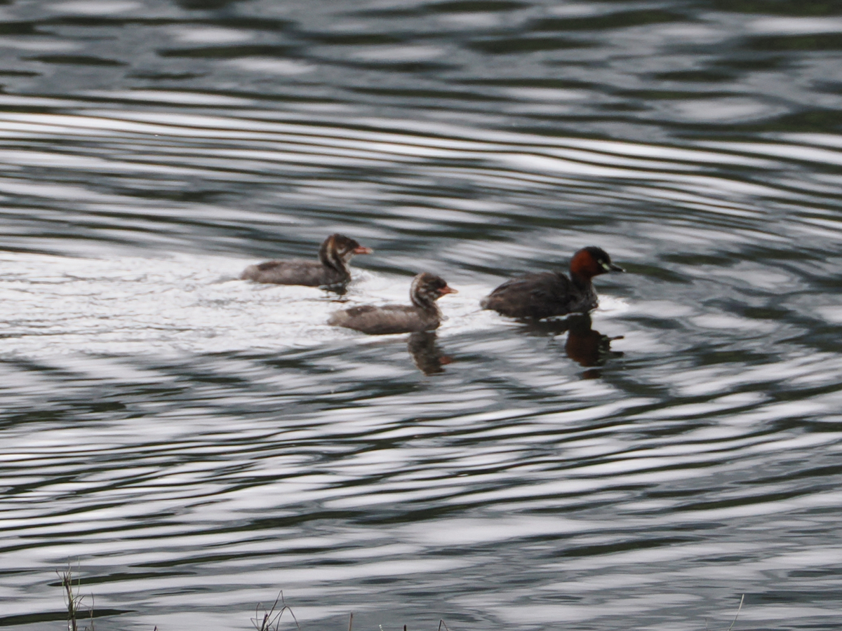 カイツブリは雛に小魚や水棲昆虫などを与えるようです。ただ、展望デッキの近くでなく水草群の向こう(遠く)にいることが多く、実際に何を与えているのかまではなかなか見ることができません。