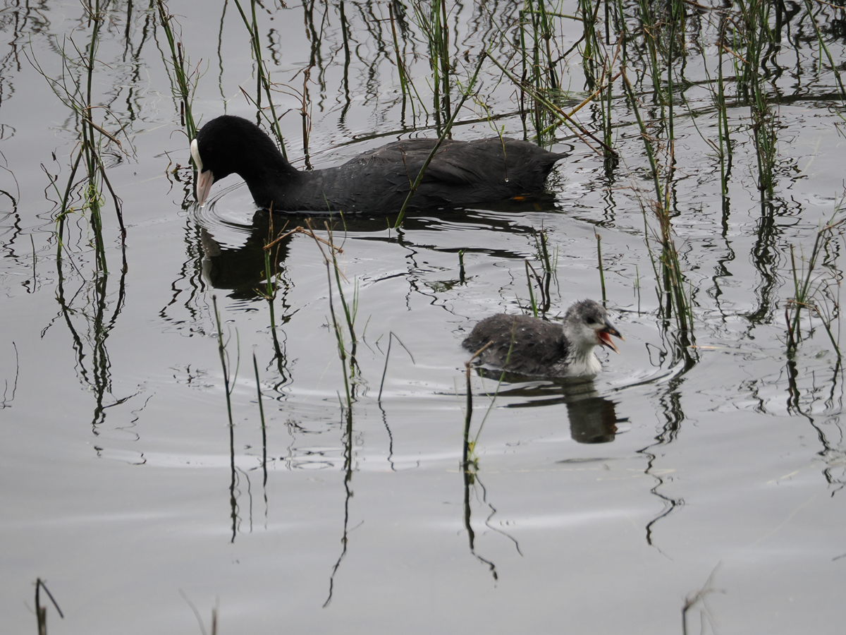 オオバンは第二展望デッキのすぐ近くにいることも多く、潜って水草を採っては雛に食べさせる姿が愛情を感じさせます。(人が近づくと急いで逃げるので、展望デッキへはそっと近寄りましょう)