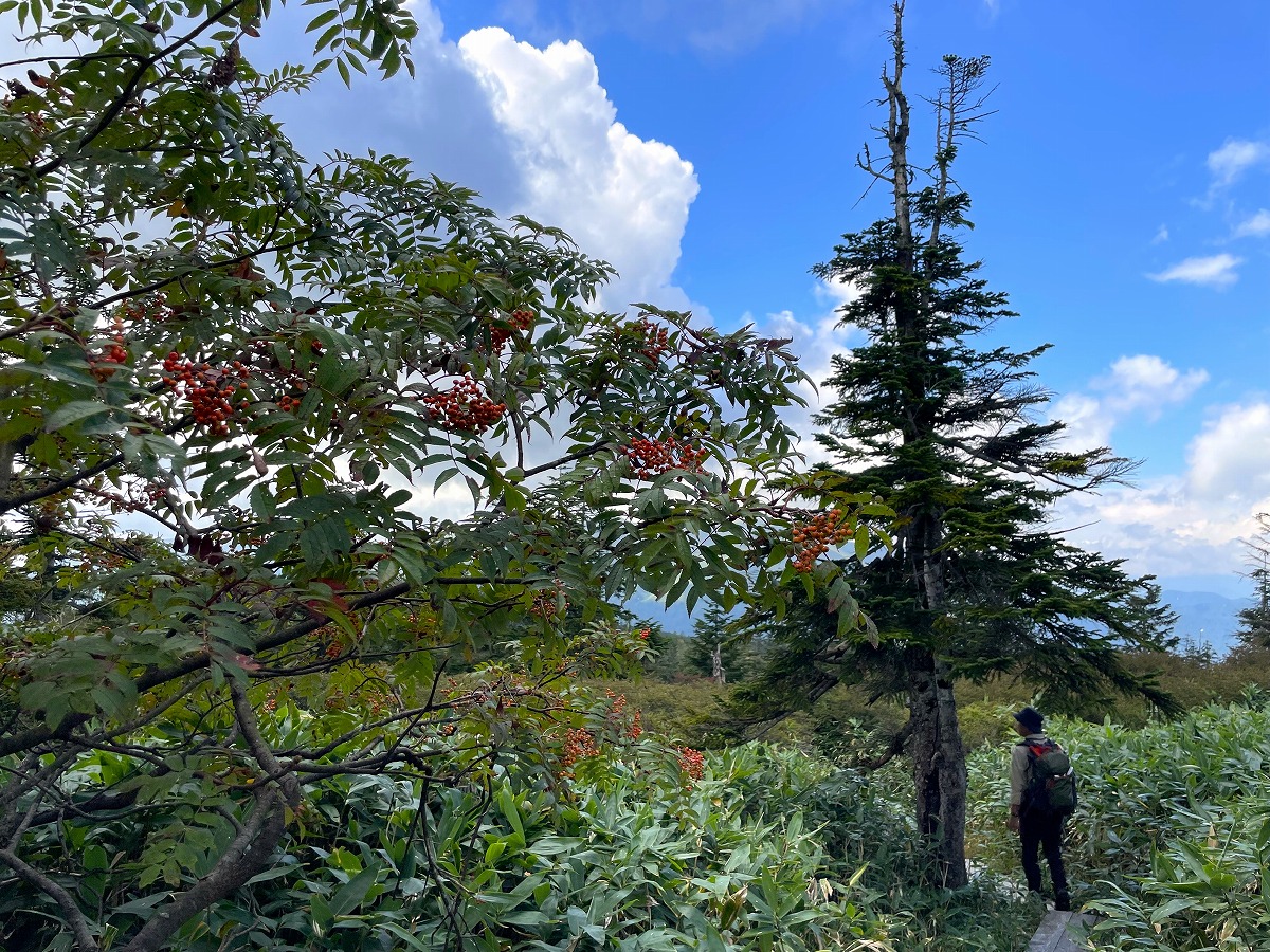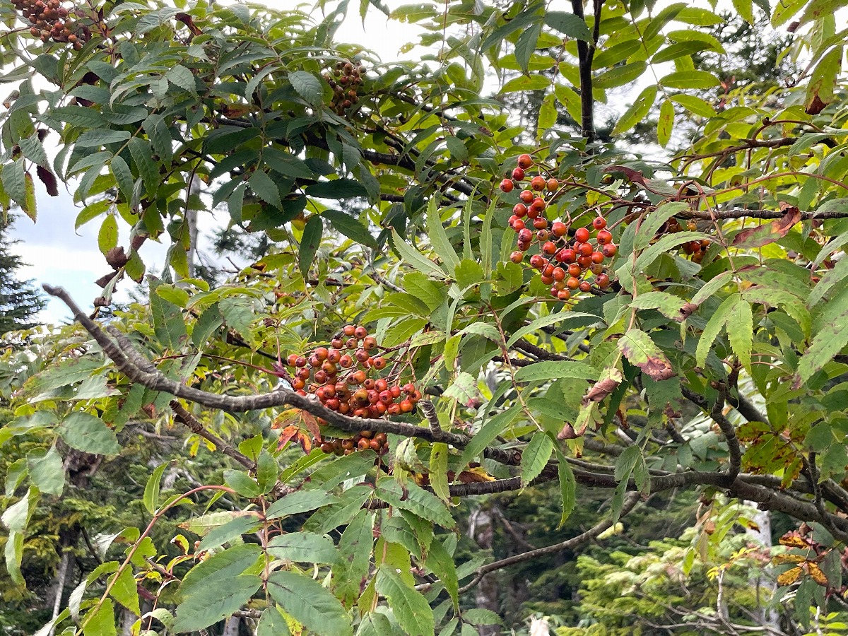 アヤメ平と横田代間の林内では、ナナカマドの実が真っ赤に色づいています。もうすぐ葉も真っ赤に色づき始めることでしょう。ナナカマドの名前は、七度窯に入れても燃えないことに由来しています。ナナカマドは質の硬い堅炭(かたすみ)となり、火力が強く火持ちがよい炭になったそうです。