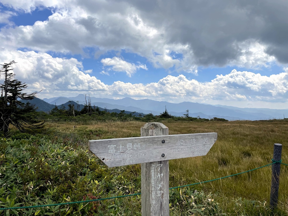 アヤメ平のベンチから南東方向を見ると、遠くに日光白根山などの山容を望めます。