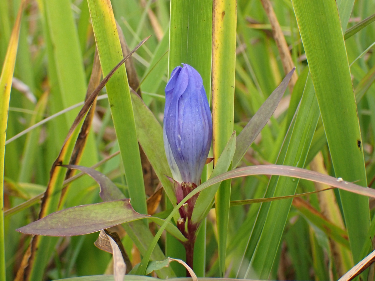 湿原の背の高いカヤ類の間から、ちらりと見える紫はエゾリンドウ。ほっそりした葉とふっくらしたつぼみが特徴ですね。湿原を彩る最終ランナーです。