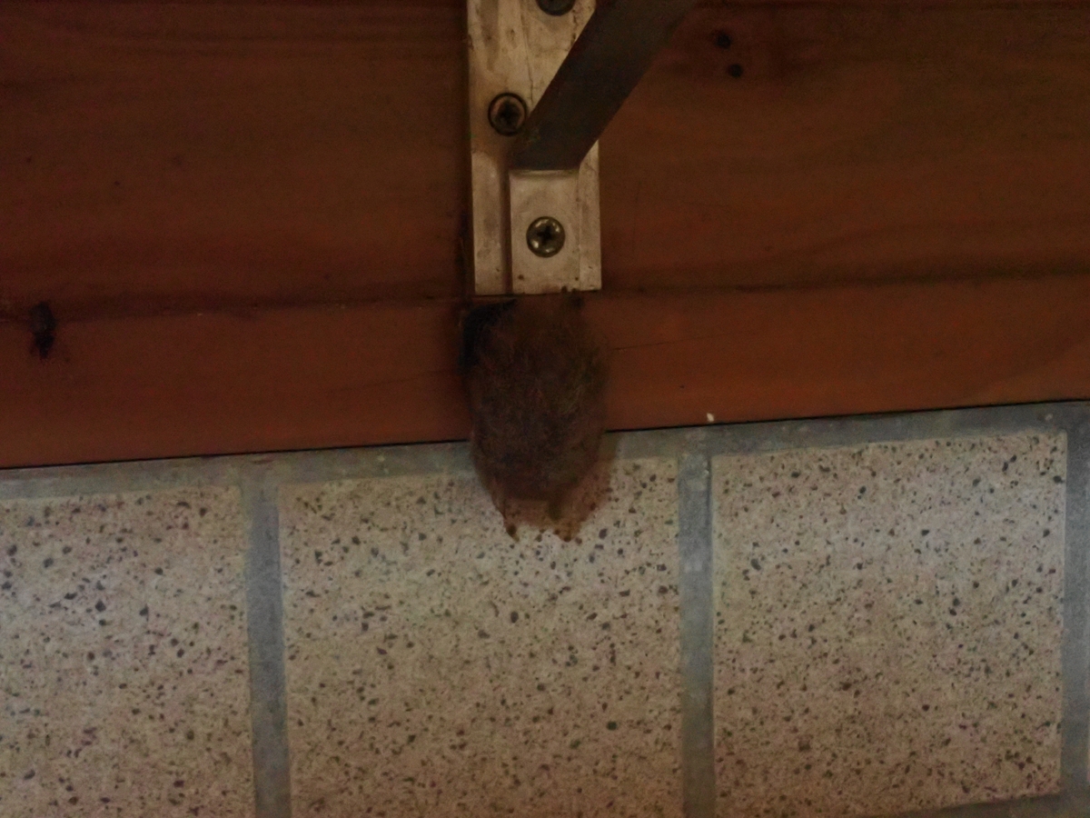 トイレットペーパーが置いてある木の棚の下に、さかさまにぶら下がっていました。よく見ると、ぶら下がっている足の爪や、下に向かってとがった耳が2つあるのが分かります。