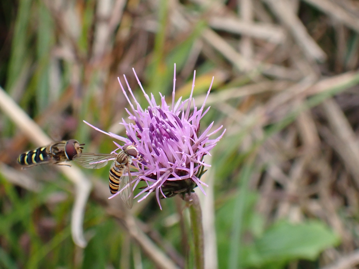湿原のお花はずいぶん減ってしまったので、1輪咲いていたオゼヌマアザミに、ハナアブやチョウなどが入れ替わり立ち替わり蜜を吸いに来ていました。