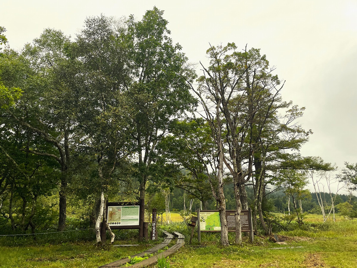 研究見本園の看板周辺には、背丈の高いミズナラなどの様々な樹木が生えています。木道沿いに歩いていくと、入り口ゲート付近にも樹木があり、私たちをお出迎えしてくれているかのようです。