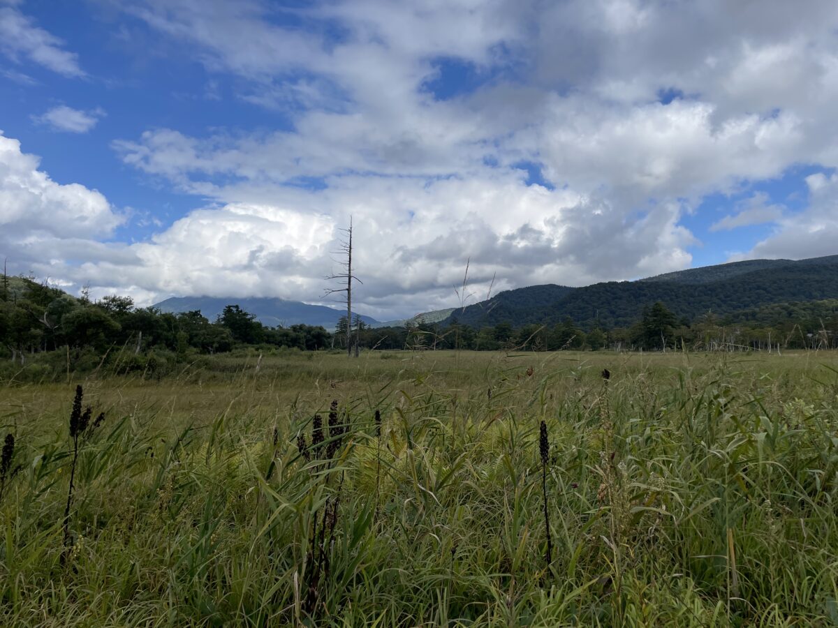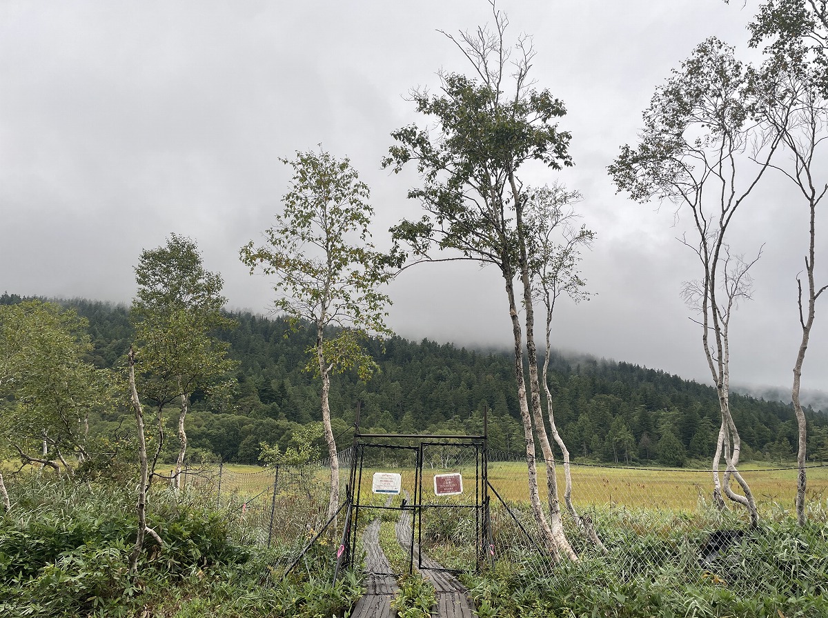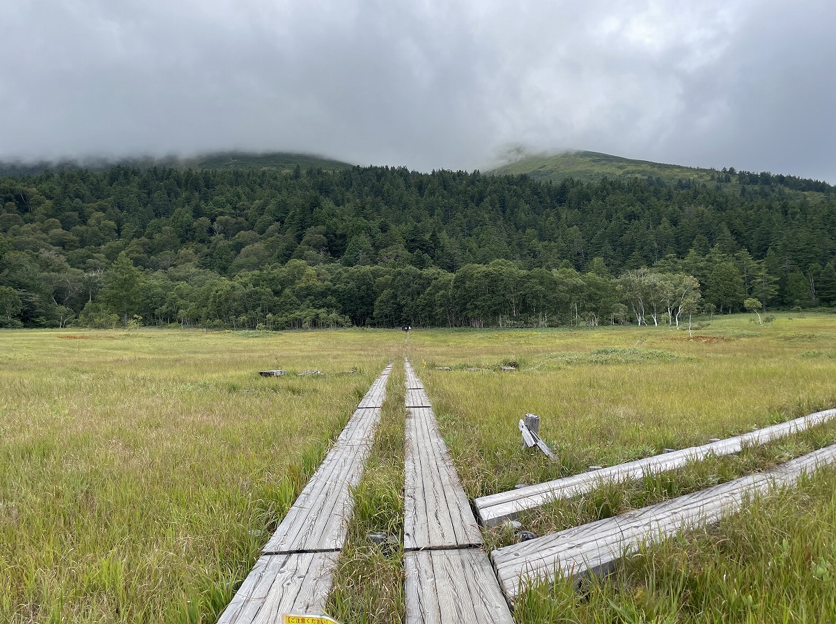 至仏山方向を眺めると、森林限界より上は厚い雲で覆われていました。晴れている日は、目の前に雄大な山の姿を見ることができます。自然豊かな尾瀬にはたくさんの生きものが暮らしており、人気の少ない早朝では、静けさの中、遠くの方から鳥や虫の鳴き声が聞こえてきました。