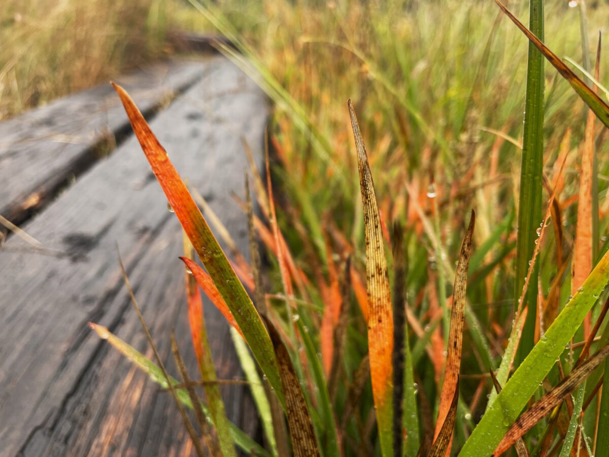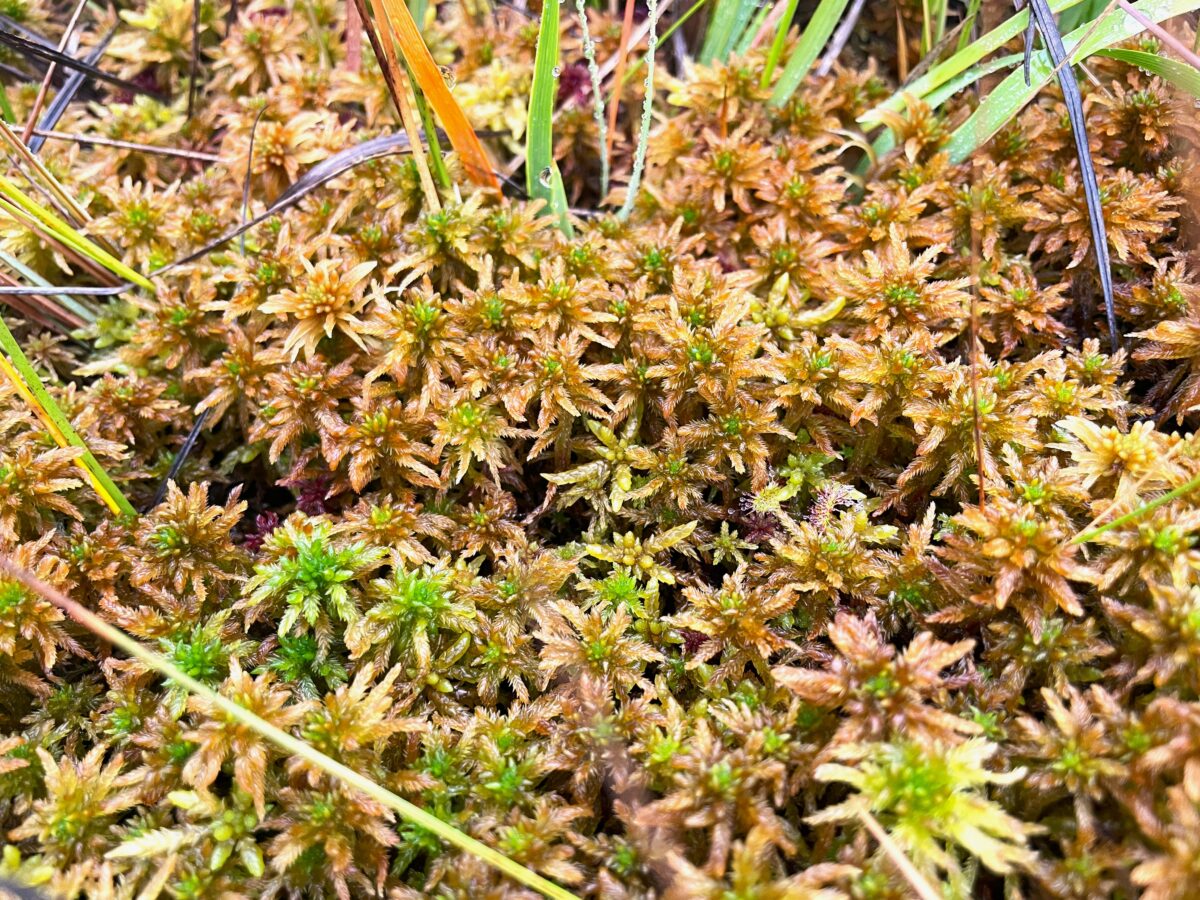 足元に目を向けると、池塘の周りに生えているミズコケや木道沿いの草が季節感のある暖色に移り変わっていました。夏真っ盛りの頃は緑色でしたが、今は赤みを帯びて、湿原を彩る草もみじの一部となっているようです。ミズゴケはスポンジのようにふかふかしていて水を多く含み、直射日光が当たる湿原を湿った状態に保つ役割を果たしています。