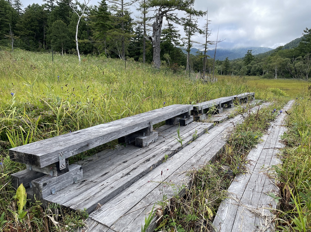研究見本園の奥の方は人の気配も少なく、外回りに設置されているこちらのベンチに座り、広大な景色を楽しむことができます。秋の気配が漂う尾瀬で、のんびりとした時間を過ごしてみませんか。