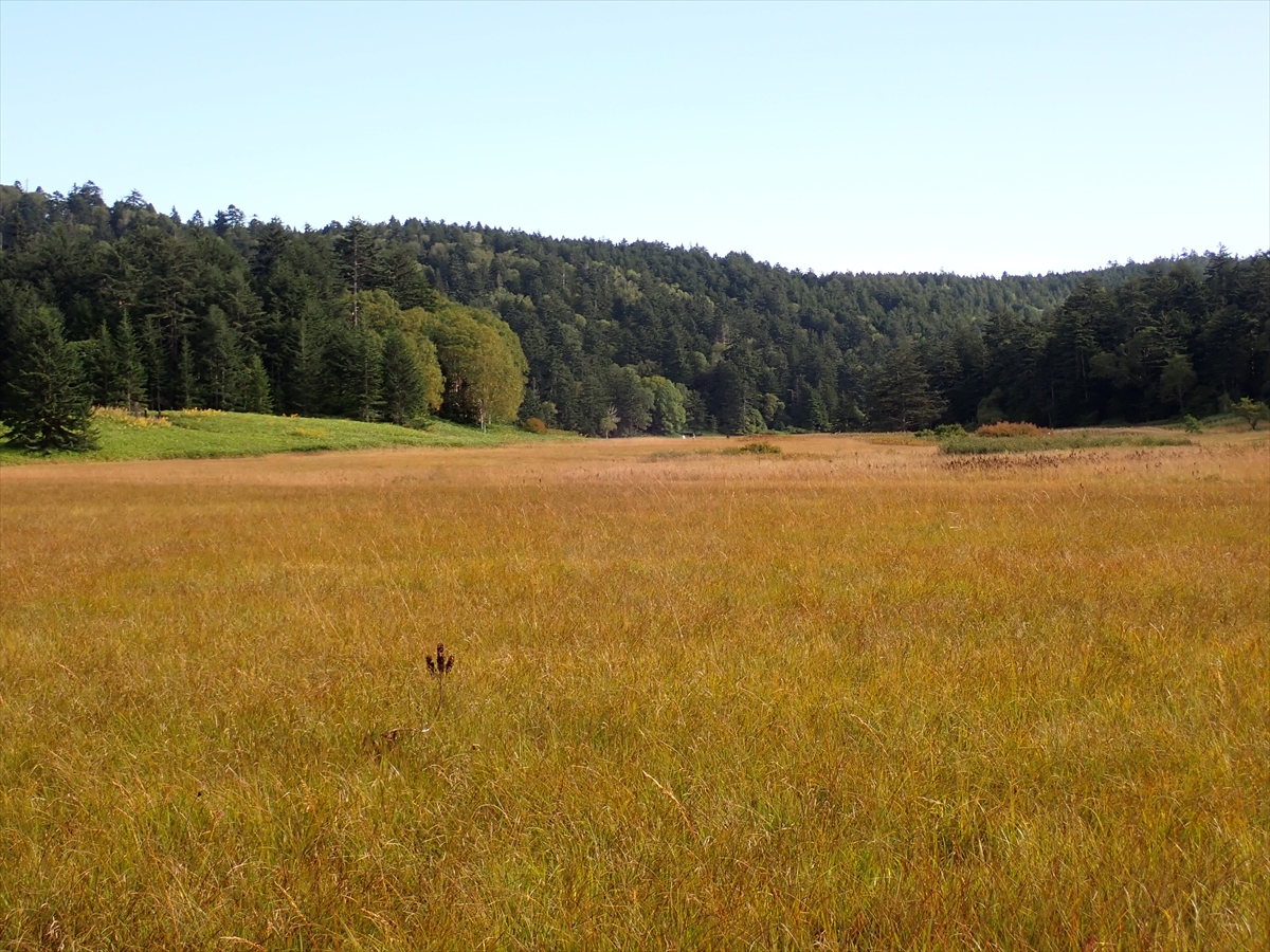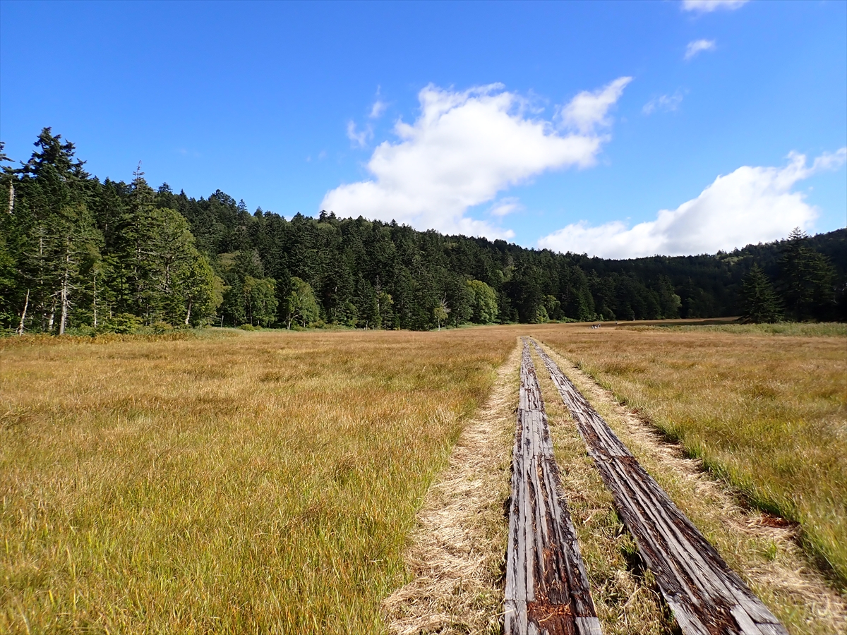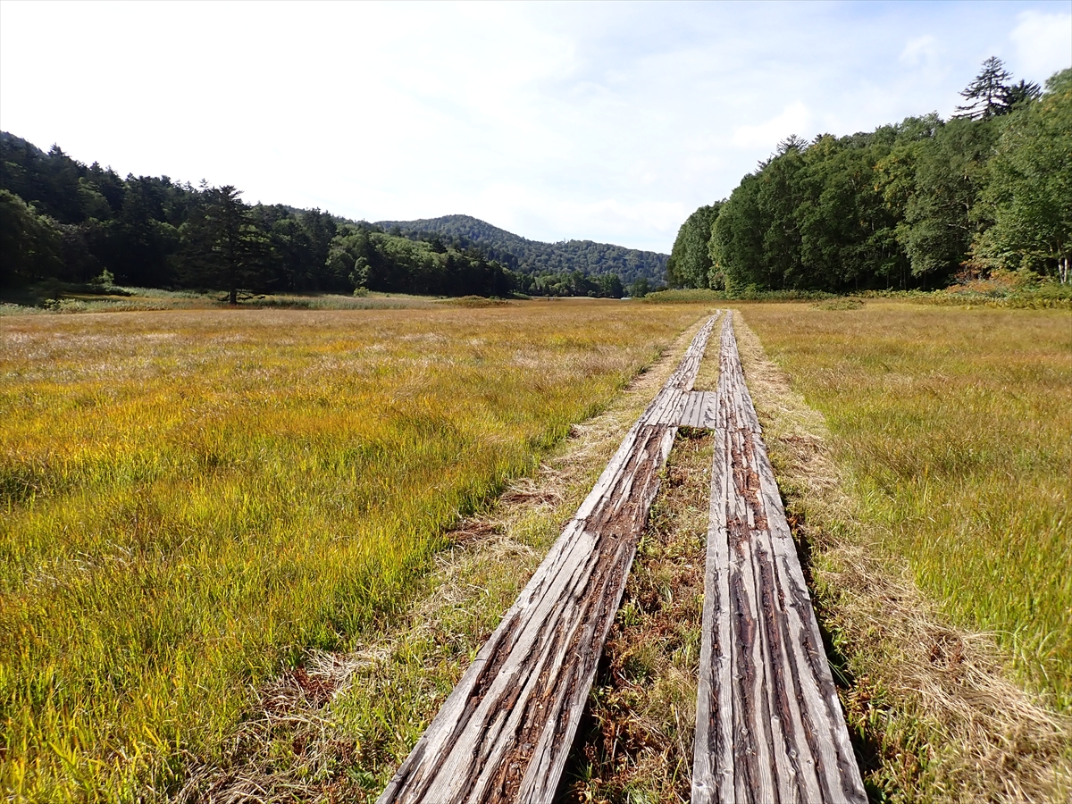 大江湿原の土塁跡付近木道から北側(沼山峠側)を向いた風景です。湿原は徐々に緑が減り枯葉色に近づいています。