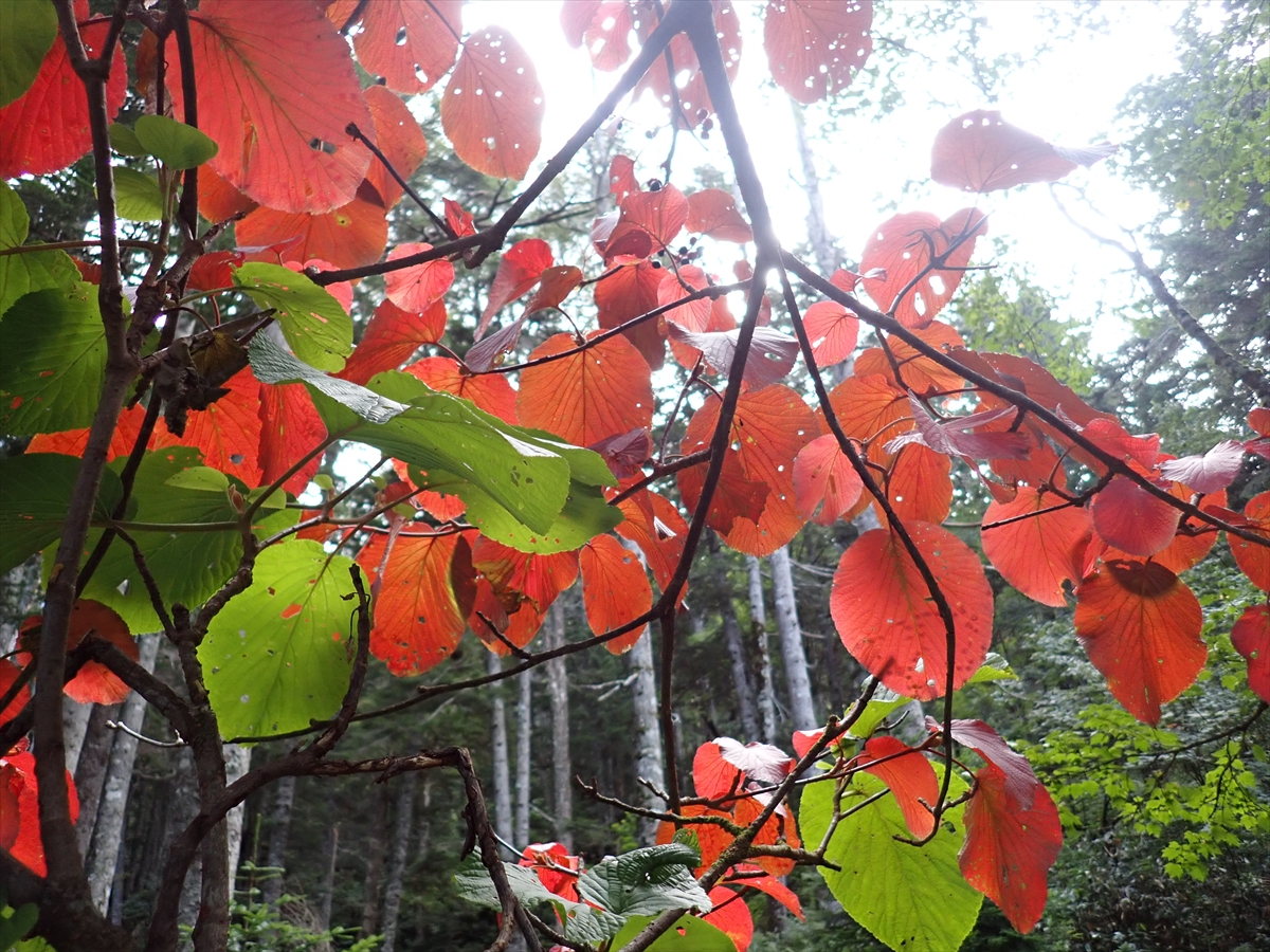森林内のオオカメノキは、あちこちで紅葉が始まっています。場所によってはナナカマドも赤く色づいていました。