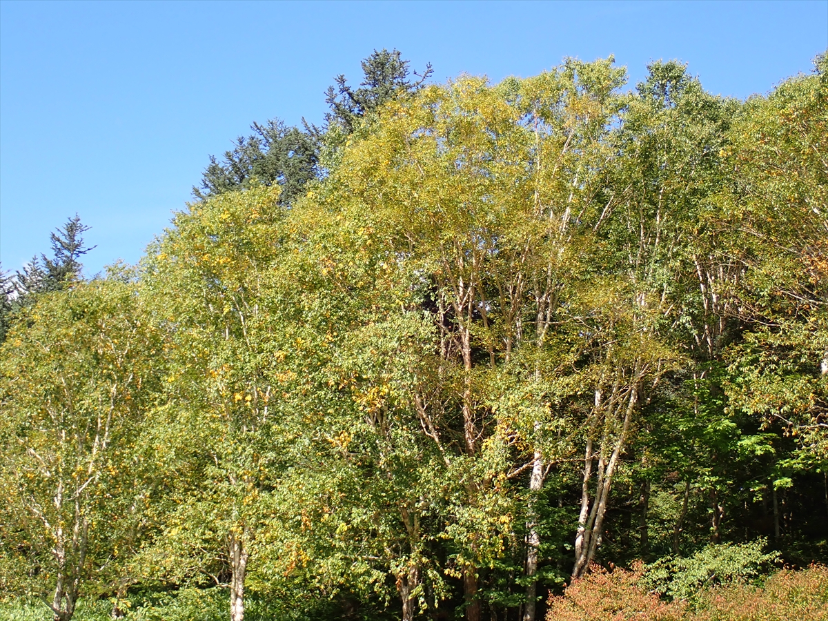 大江湿原のダケカンバが少しずつ黄色く色づいているのかおわかりになるでしょうか。比較的陽当たりのよい場所でも、全体が黄色く染まるのは来月になりそうですね。