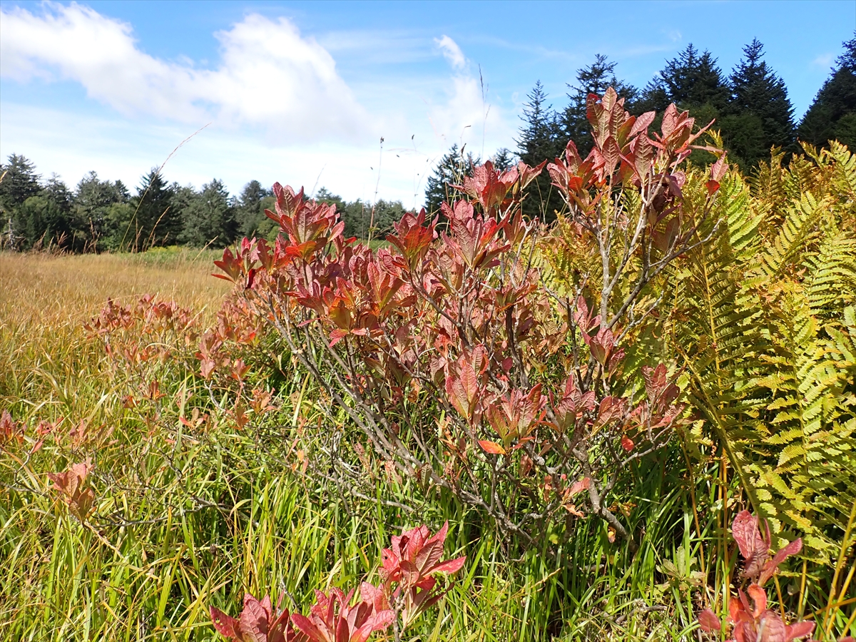 これらを踏まえて大江湿原をあらためて見ると、森の中でダケカンバがうっすら黄色く色づき始め、湿原の草紅葉の中で他に紅葉の始まった植物の姿を見ることができると思います。これからどのように変化していくのか、とても楽しみです。