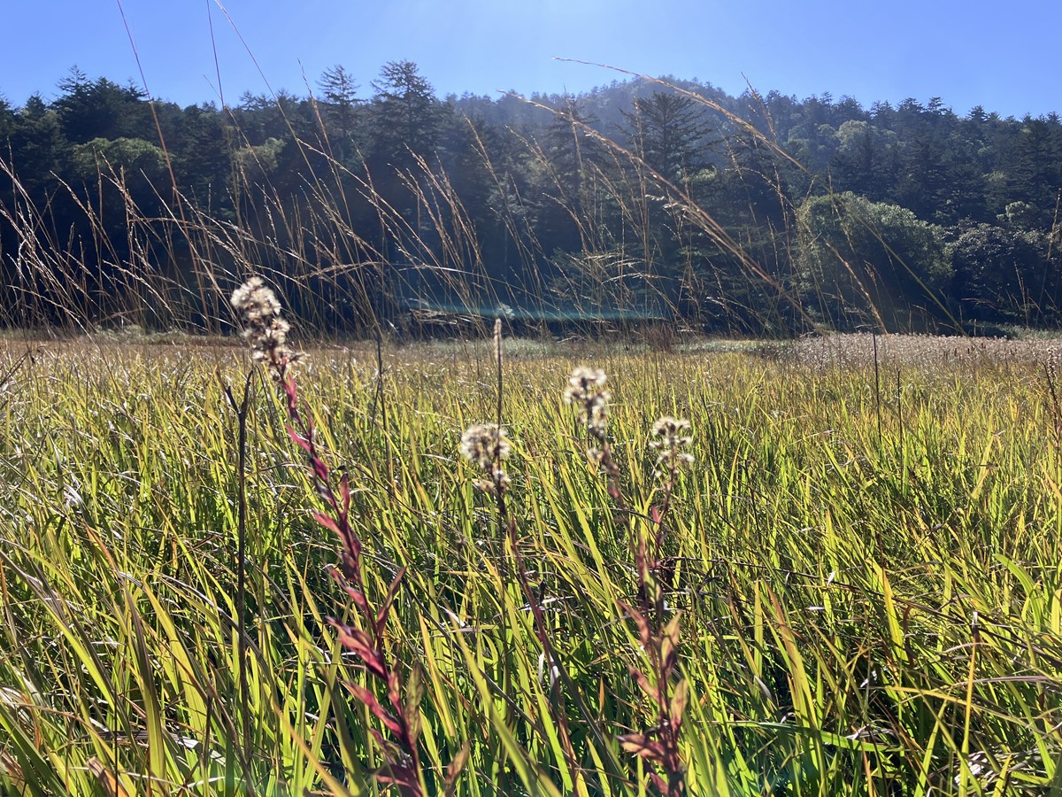 三本カラマツの根本の笹の緑が目立つのは、草紅葉が進んできたからですね。三本カラマツ自体は、うっすら色づきが始まった様子です。大江湿原は、日光が当たると枯れた草が輝いて豊かな黄金色に見えます。