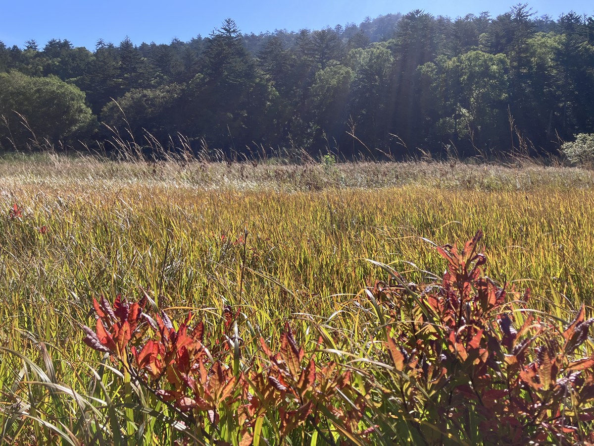 今朝は、澄んだ秋晴れの空に恵まれました。太陽の光を暖かいと感じるほど、朝晩は気温が下がってきました。 では、湿原の草紅葉の進み具合をご覧ください。