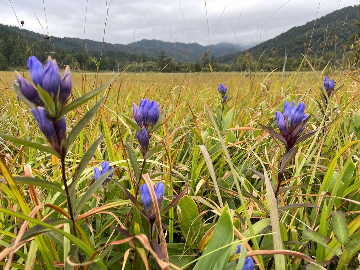 尾瀬のシーズン最後に咲くエゾリンドウが、木道脇でたくさん鮮やかな青紫色の姿を見せています。すっと立ち上がった茎の頂と、上部の葉の付け根に数段にわたって花を付け、晴れると花の先端が少しだけ開きます。漢字では蝦夷竜胆と書き、北海道「蝦夷」など寒冷な地域に多く自生していること、漢方薬に利用されるリンドウの根が非常に苦いことから中国の古い言葉「竜の胆のように苦い」に由来しているそうです。