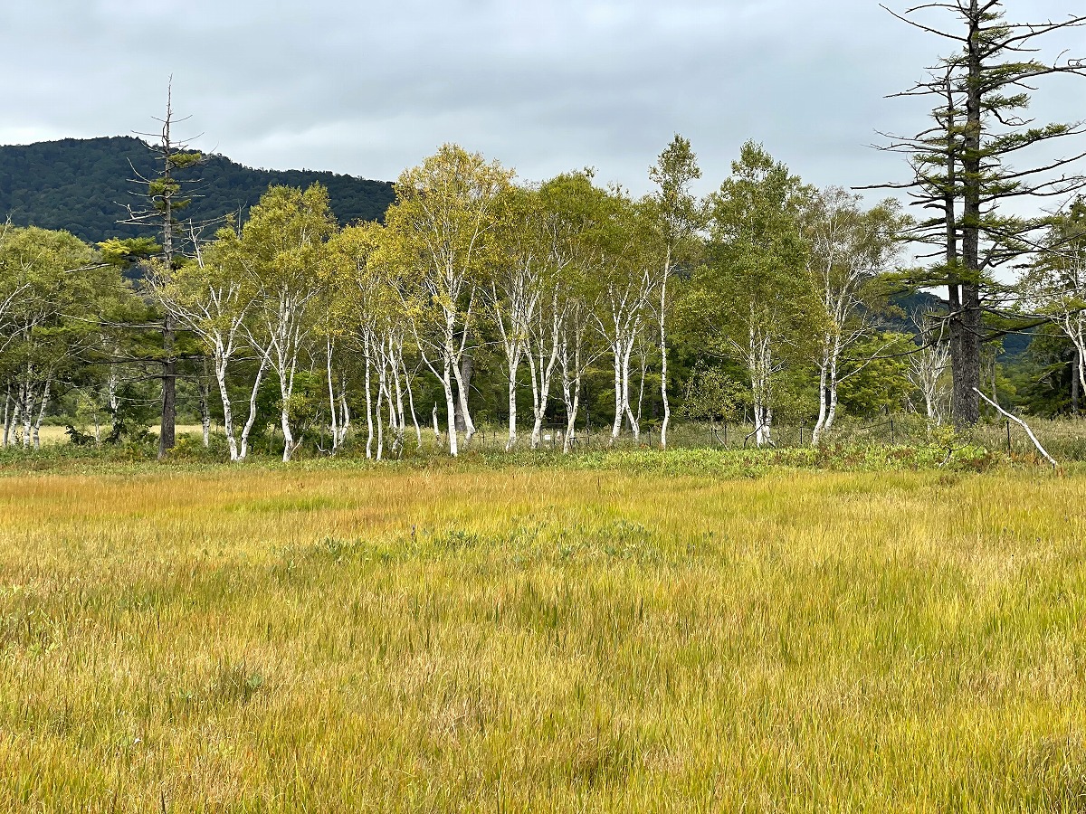 シラカバの葉が黄に色づき始めました。草もみじの湿原にシラカバの幹の白が映えます。