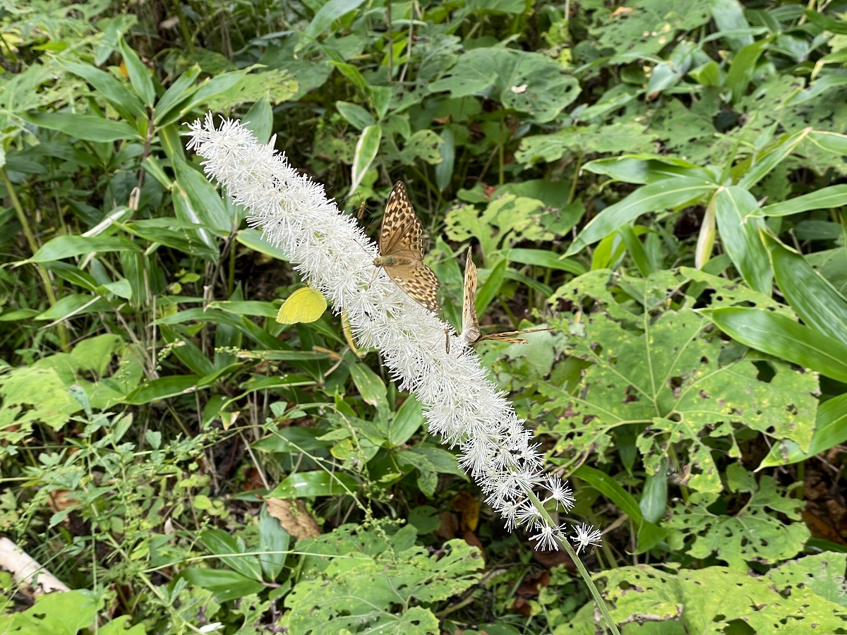 山の鼻ビジターセンター入口階段前のオオツリバナの葉が真っ赤に紅葉し、とても目立っています。花が少なくなったこの時期に、まだブラシのように花を咲かせているサラシナショウマの蜜を求めて虫たちが集まっていました。