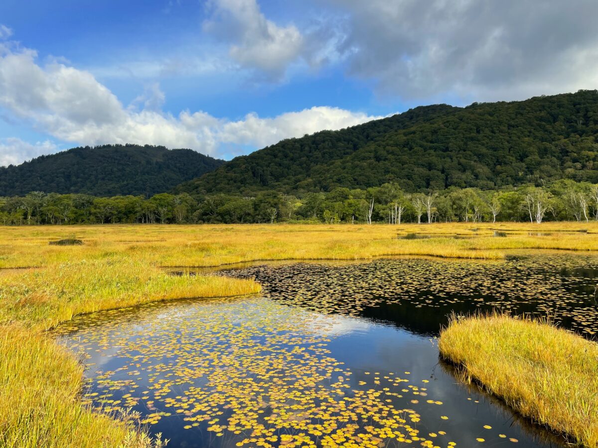 池塘に浮かぶヒツジグサの紅葉以外にも、水色の空や白い雲など、様々な色が目に焼き付きます。草もみじが進んでいる現在、どのタイミングで訪れても思い出に残る貴重な景色を見ることができると思います。日々変化し続けている大自然の尾瀬にぜひお越しください。