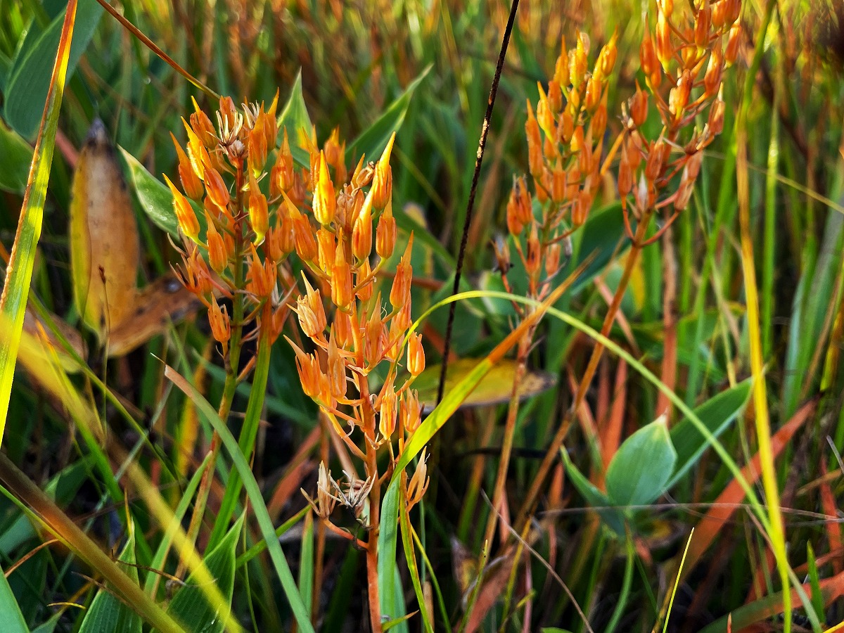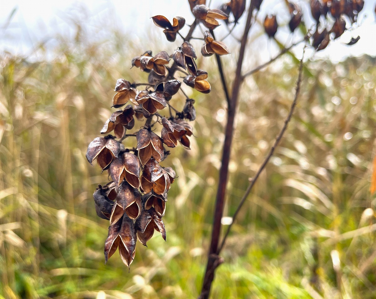 園内を歩いていると、コバイケイソウの枯れゆく濃い色が目に留まります。近づいてよーく見てみると種子が入っていた部分が裂け、中身は空っぽでした。