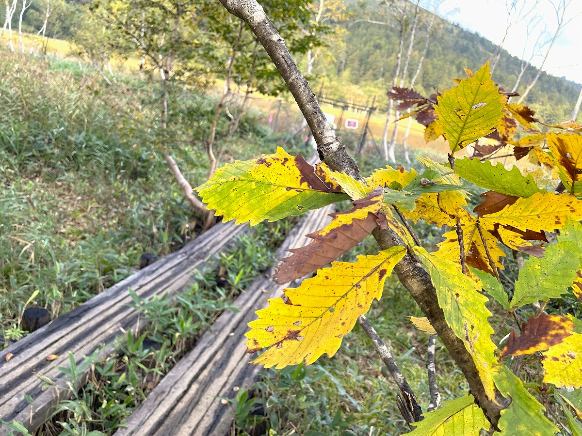 写真の色付くキンコウカもミズナラの葉も、のちに尾瀬の湿原の一部となるでしょう。