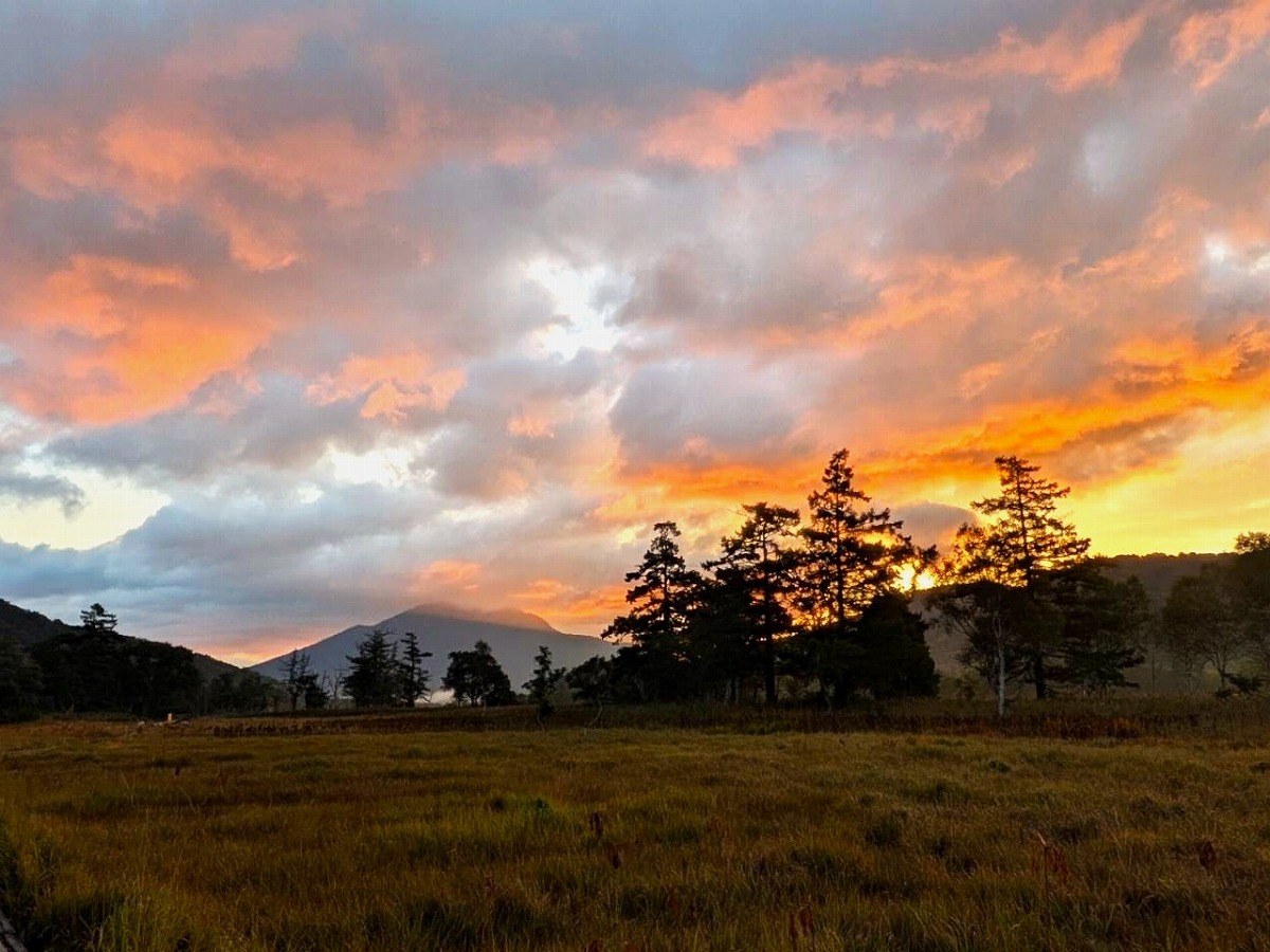 燧ヶ岳方面が朝焼けでオレンジ色に染まっていました。早朝に空が焼けた日は、太陽が昇るまでの間、鮮やかな色が刻々と変化していく幻想的な景色を堪能することができます。