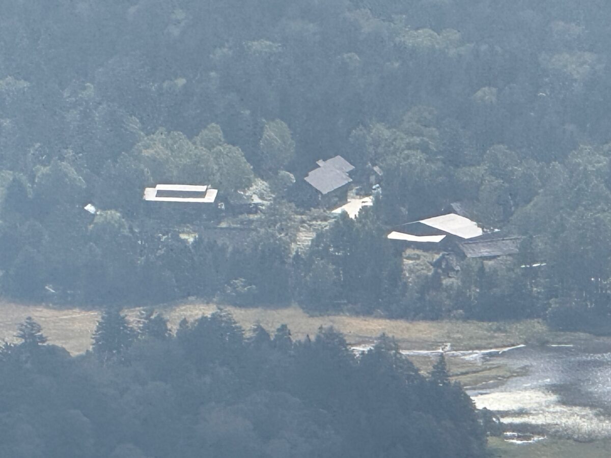 尾瀬沼東岸地区の建物もクリアに見れました。左から長蔵小屋別館、尾瀬沼ヒュッテ、尾瀬沼ビジターセンター、長蔵小屋です。