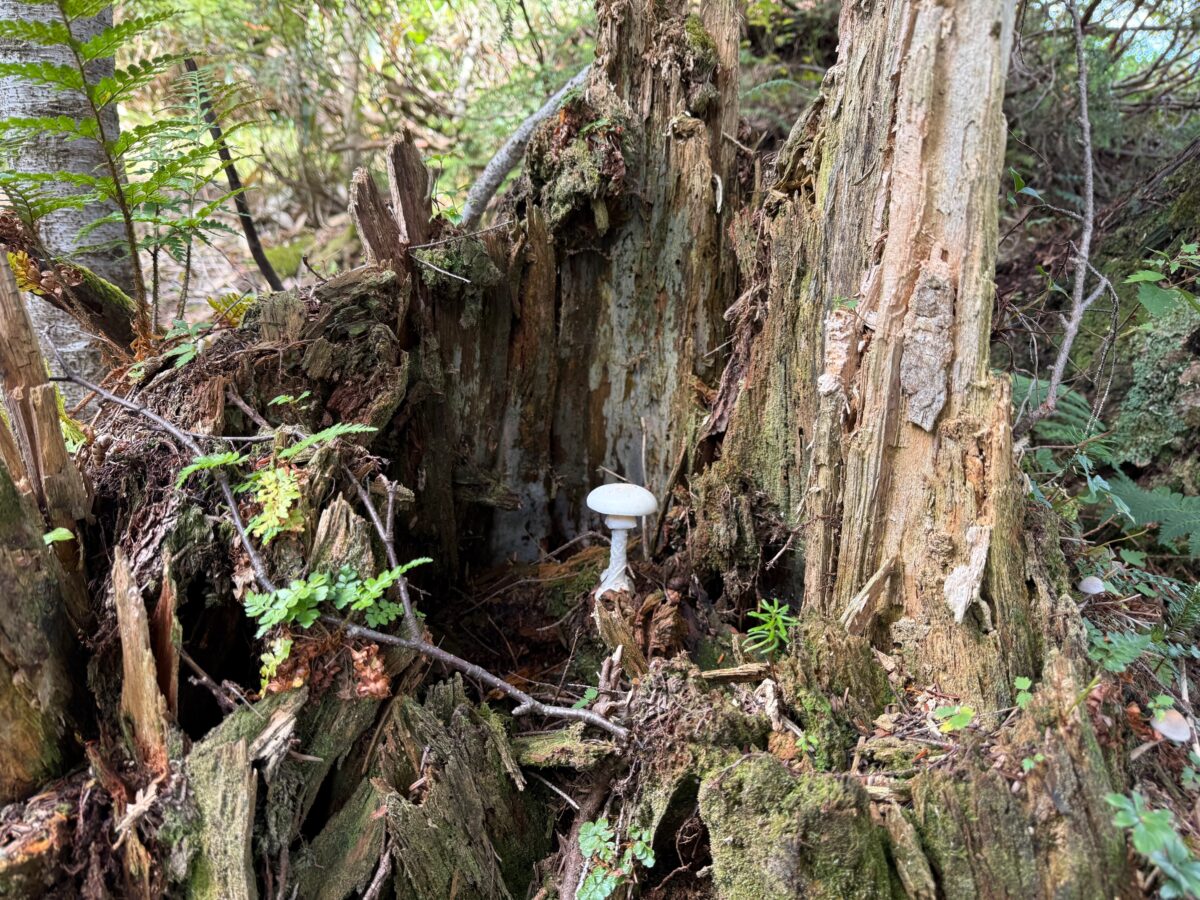 長英新道2号目付近で真っ白な猛毒のドクツルタケがいくつか見られました。その中でもこちらは枯れ木の真ん中にまるでご神体の様にドクツルタケが安置(笑!)されていました。