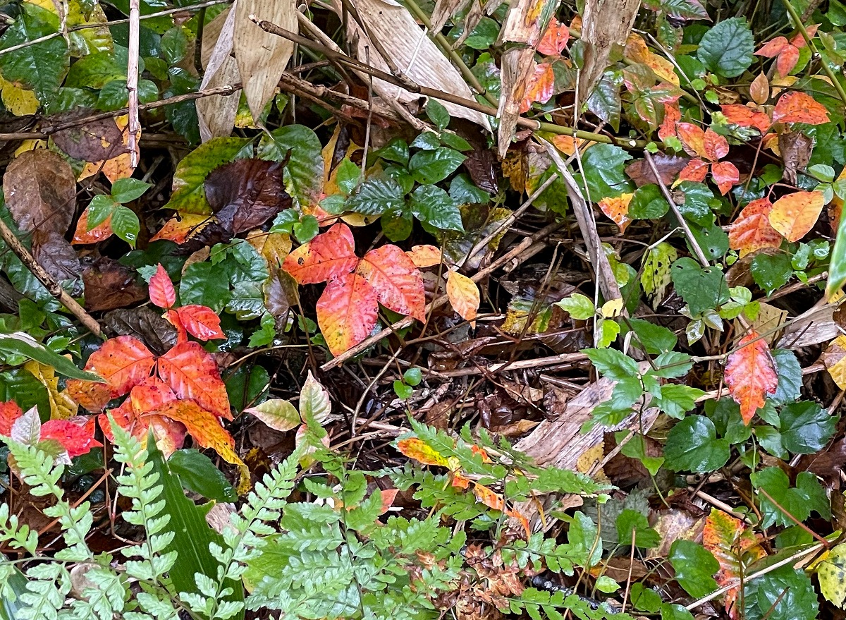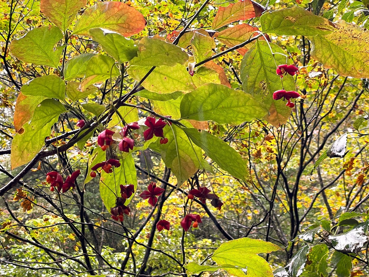 他の樹木に這いあがっているツタウルシの葉がまっ赤に色づいています。木道脇や木道の間でも色づいた葉を見ることができます。きれいなので赤い葉をつい触ってみたくなりますが、皮膚炎を起こすことがあるので止めておきましょう。ウルシ科の中でも特に毒性が強いといわれています。