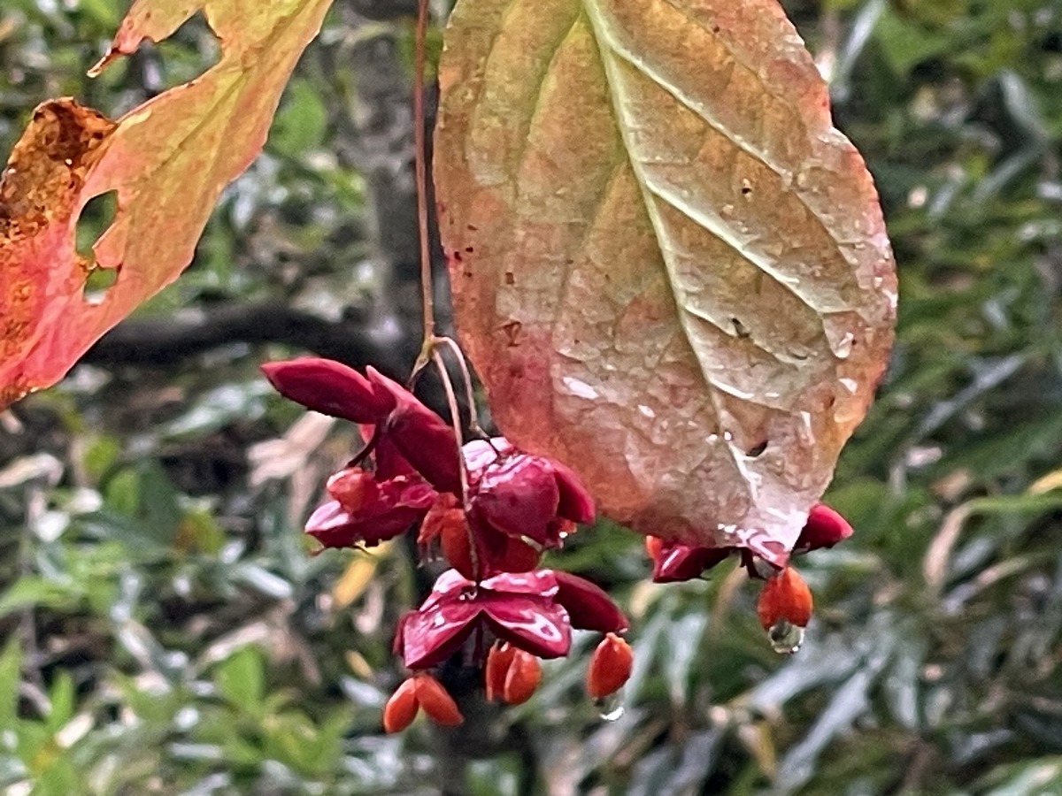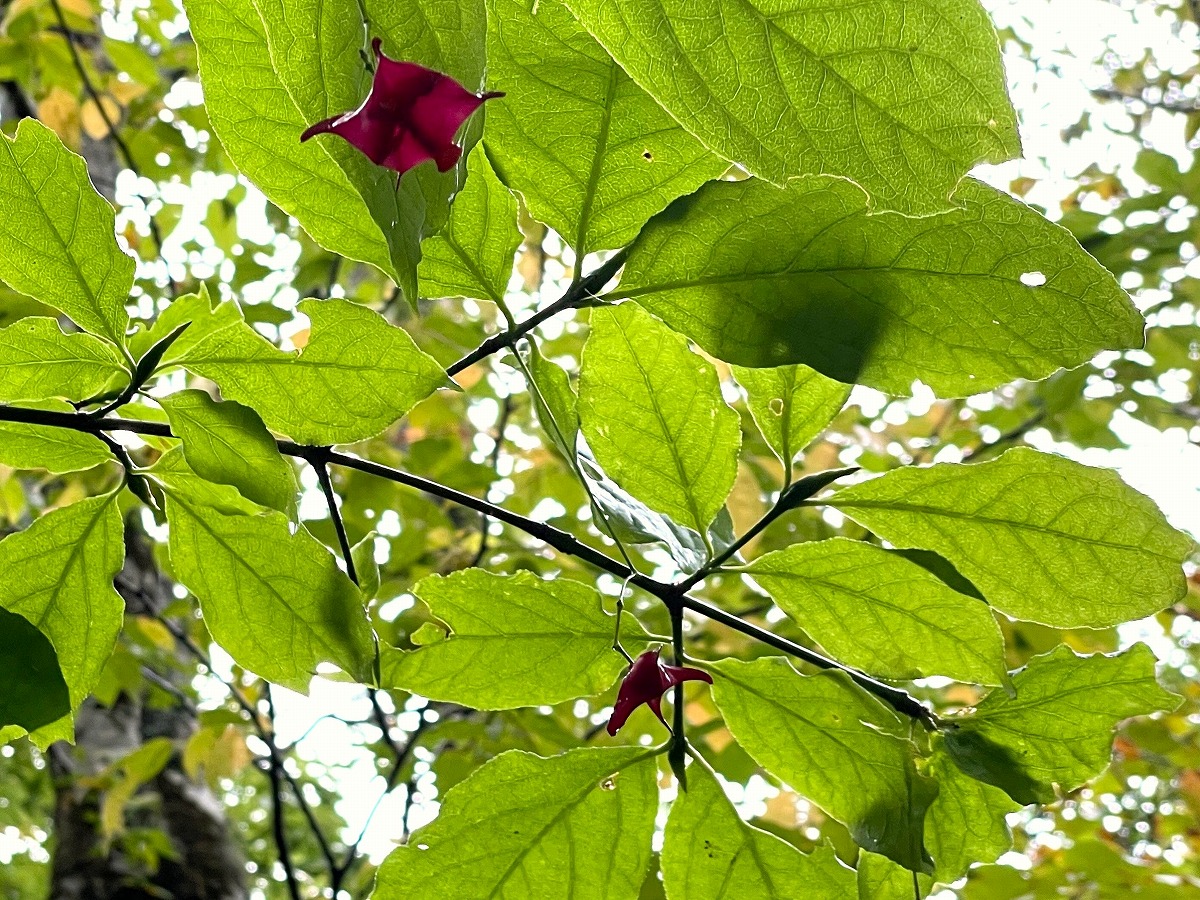 どちらのツリバナの実も4裂まれに5裂に弾けて、種を飛ばしたりぶら下げたりしています。オオツリバナの実は弾けると花のような形です。弾ける前のヒロハツリバナの実は横に張り出した4枚の翼があり、十字型に見えます。