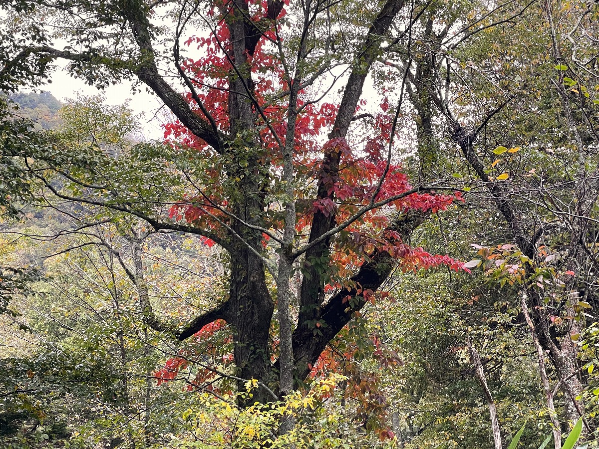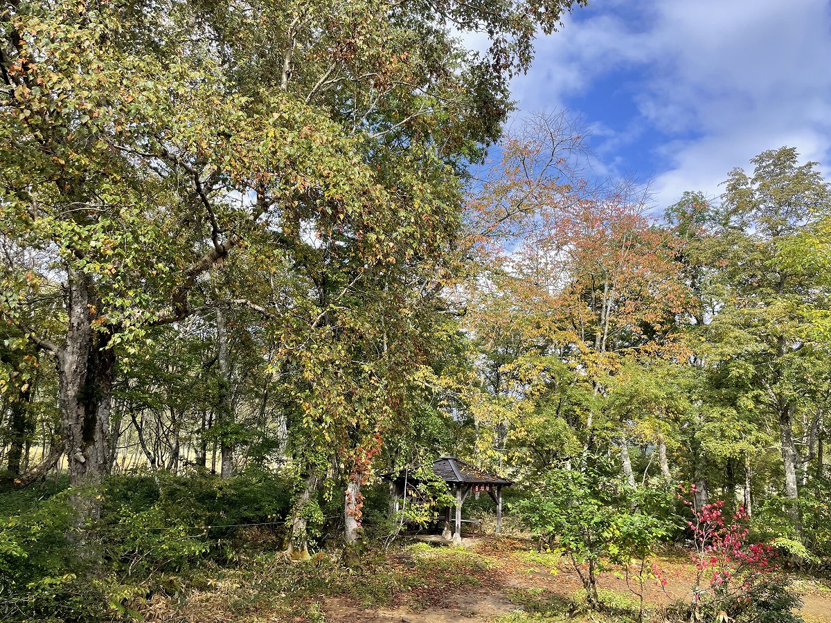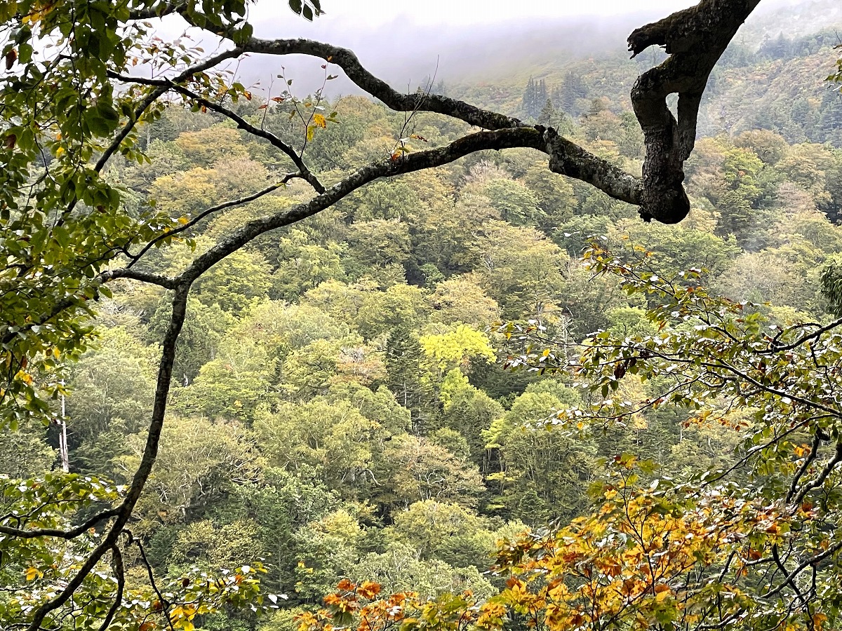 わずかな時間でしたが青空が顔を出し、日光に照らされた木々の葉が色鮮やかに見えました。木々の間から、研究見本園の草もみじも見えます。どうぞ秋が深まる尾瀬を味わいにいらしてください。