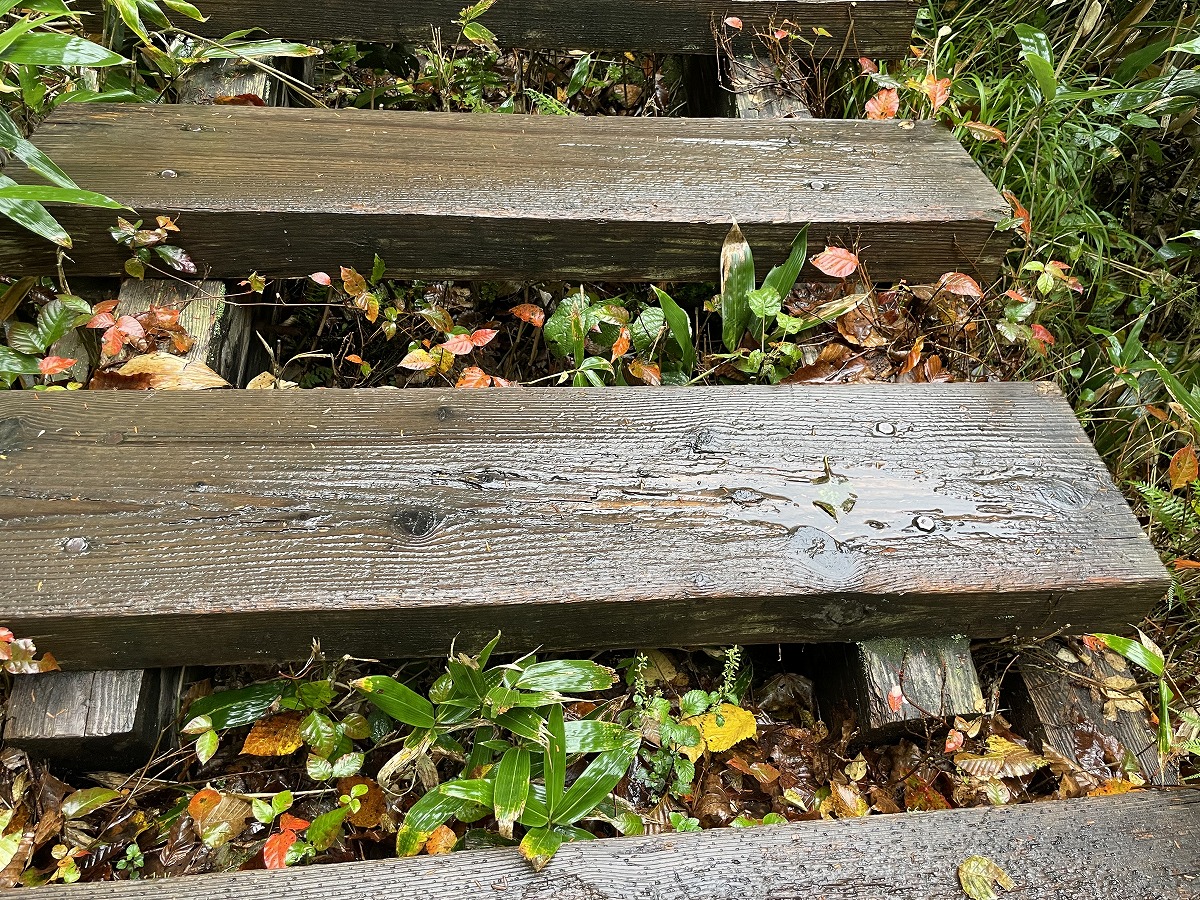 鳩待峠から山ノ鼻に向かう木道を歩いていると、木々の間から左手に至仏山の姿が見えます。今日は雨で山頂方面は見えませんでしたが、裾野の広葉樹が少しずつ色づき始め、一本一本の木が際立って見えました。