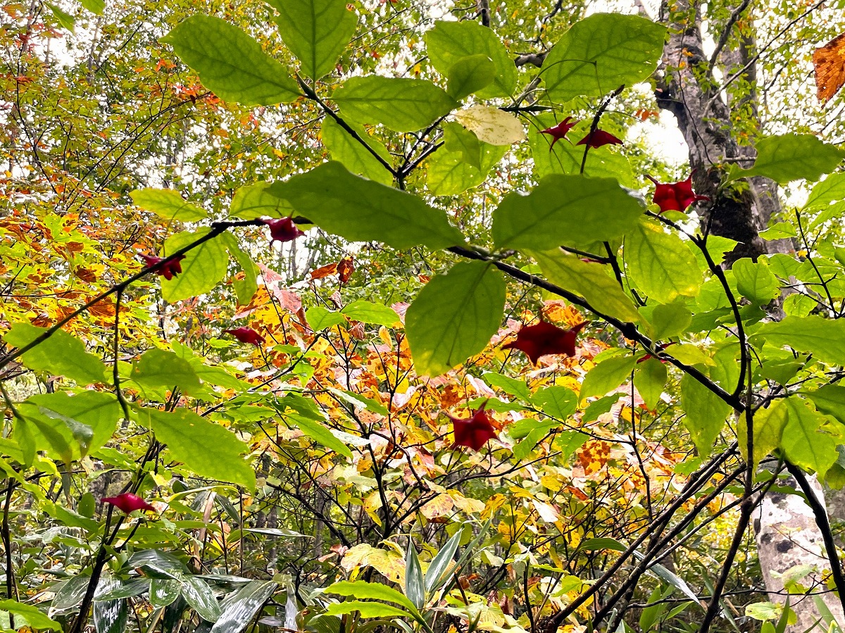 鳩待峠~山ノ鼻間を歩いていると、目に鮮やかに飛び込んでくるのは、トチノキの黄色とツタウルシの赤色です。本日は、その様子や木々の色づきなどをお伝えします。