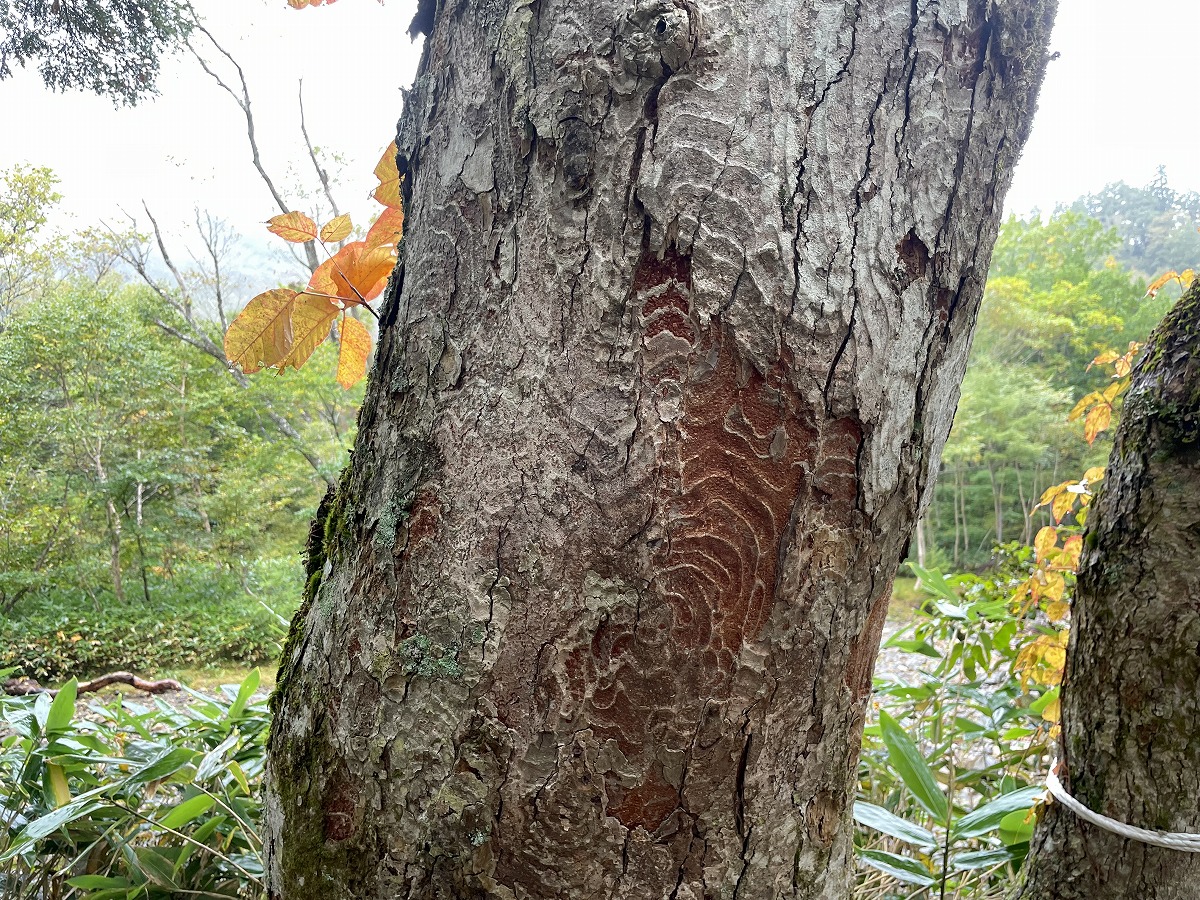 トチノキの葉がまっ黄色に色づいています。幹は、老木になると樹皮に割れ目ができて大きく剥がれ、跡が波状になります。材は、加工しやすくてひび割れが少なく、また削り面に絹のようなきれいな光沢が出るため、家具や器具、楽器などに用いられます。