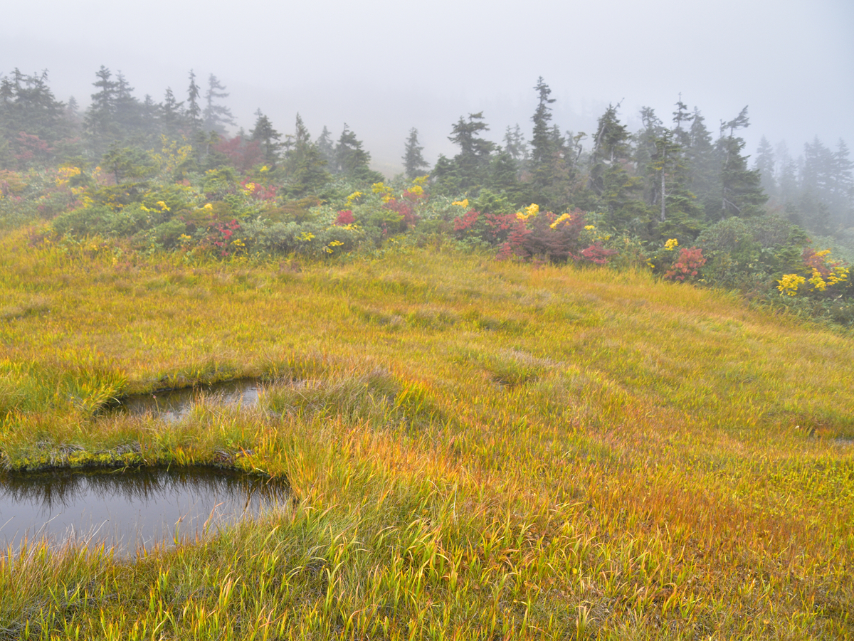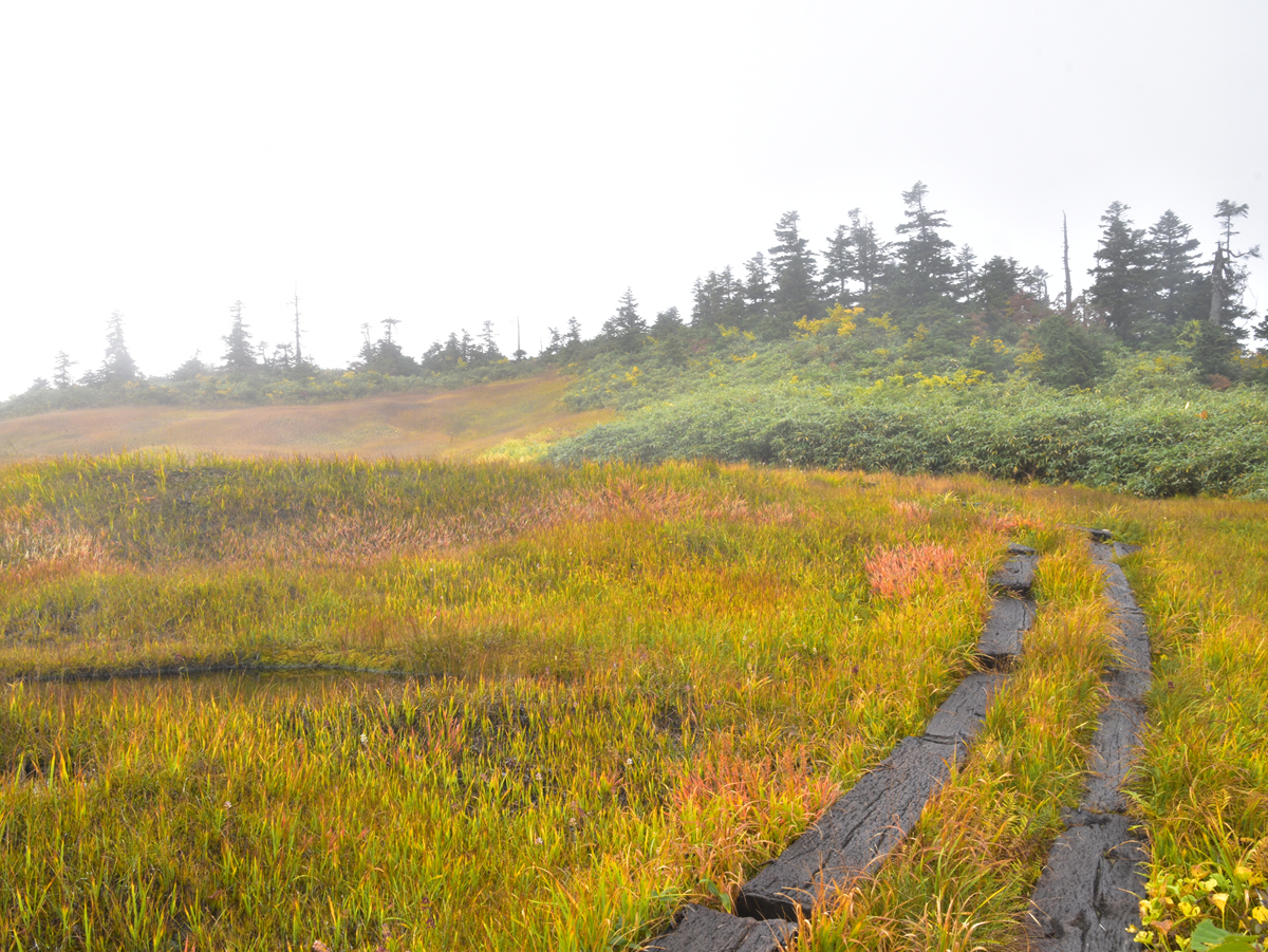 会津駒ヶ岳から中門岳にかけて、まだ目立った降霜もなく、黄金色の鮮やかな草紅葉が見られます。また、オオシラビソの深緑の合間から木々の葉が赤色や黄色に色づいた姿を見せていました。