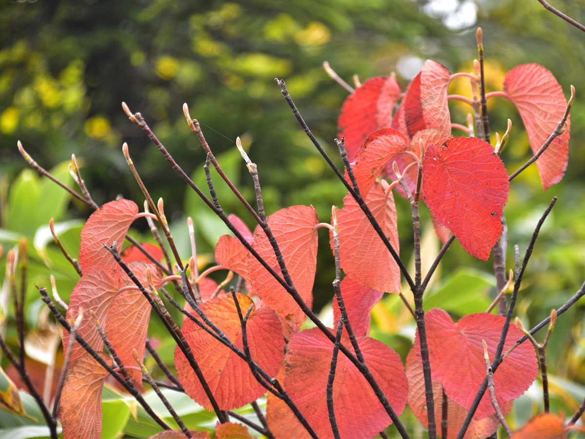 オオカメノキは、別名「ムシカリ(虫食われ・虫狩)」とも呼ばれ、葉に虫食い跡が見られることが多い樹木です。しかし今回は、亀の甲羅のように立派で穴のない大きな葉が、鮮やかに紅葉している姿を見せてくれました。