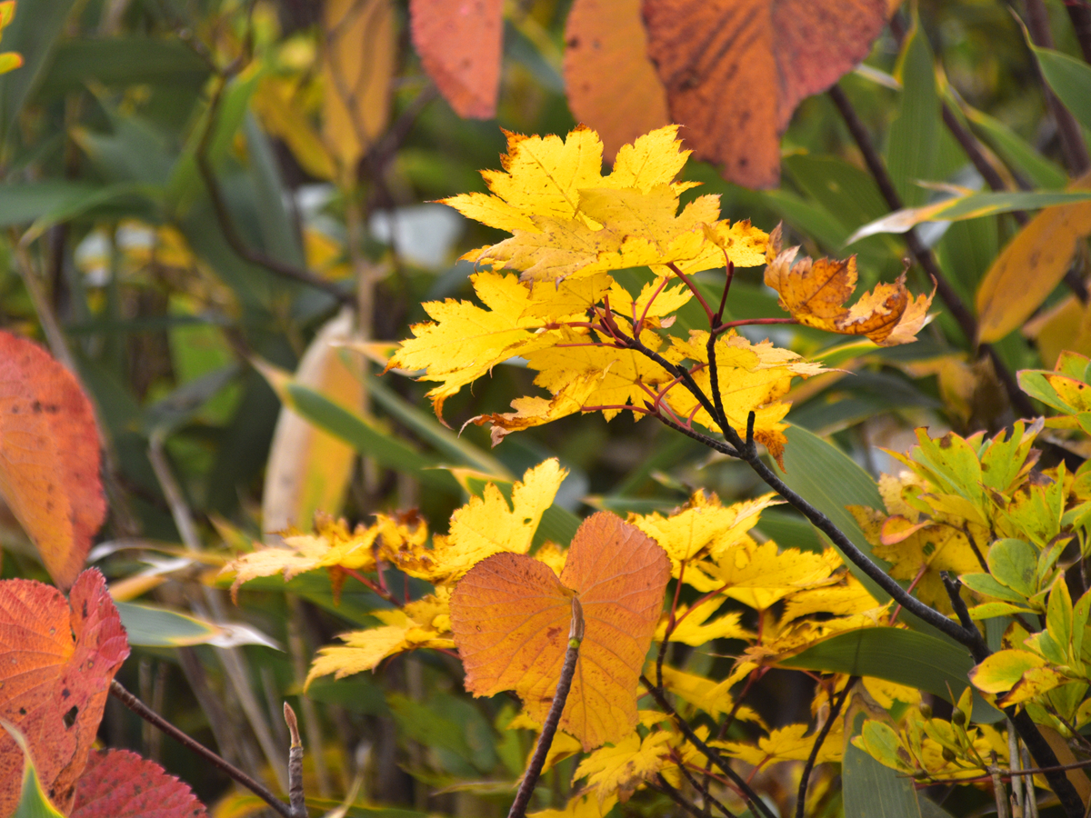 ミネカエデの仲間は近縁種との判別が難しいのですが、豪雪地帯かつ標高の高い会津駒ヶ岳山頂付近で黄色の葉を見せているので、写真はミネカエデの葉と考えられます。葉が橙色や赤色の場合はコミネカエデ、雪の少ない場所ではナンゴクミネカエデの可能性があります。