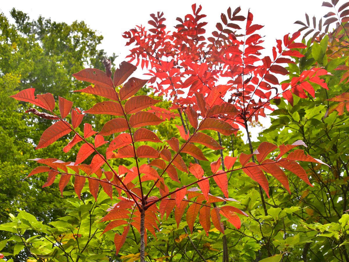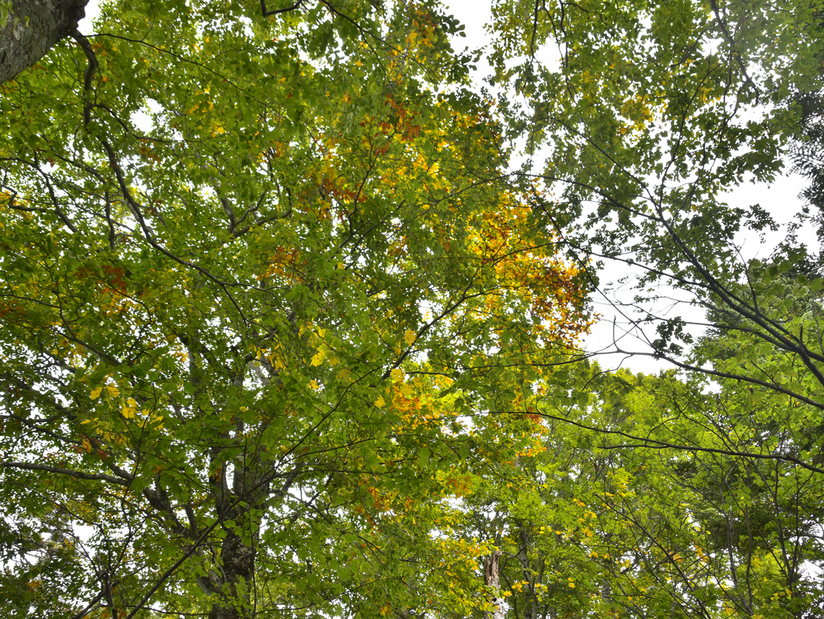 そんな緑の森の中、いち早く紅葉した姿を見せているのはヤマウルシの木でした。鮮やかな葉に思わず手を触れたくなりますが、かぶれの原因となりますので触れないようにお気をつけください。林内に比べて登山道脇に姿が多いので、少し不思議に思いましたが、調べてみるとヤマウルシは陽当たりの良い場所で急速に生育する、いわゆる「陽樹」であり登山道脇に多いことに納得がいきました。