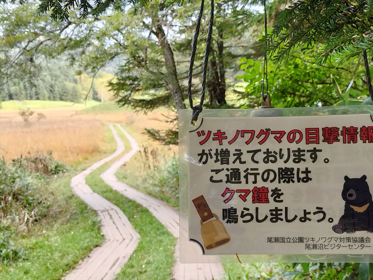 ※尾瀬沼地区においてツキノワグマの目撃報告があります。大江湿原と釜ッ堀湿原にクマ鐘を設置してあります。ツキノワグマと遭遇しないように、クマ鐘を鳴らして通行する、クマ鈴を携行するなどの安全対策をお願いします。詳しくはこちらをご覧ください。