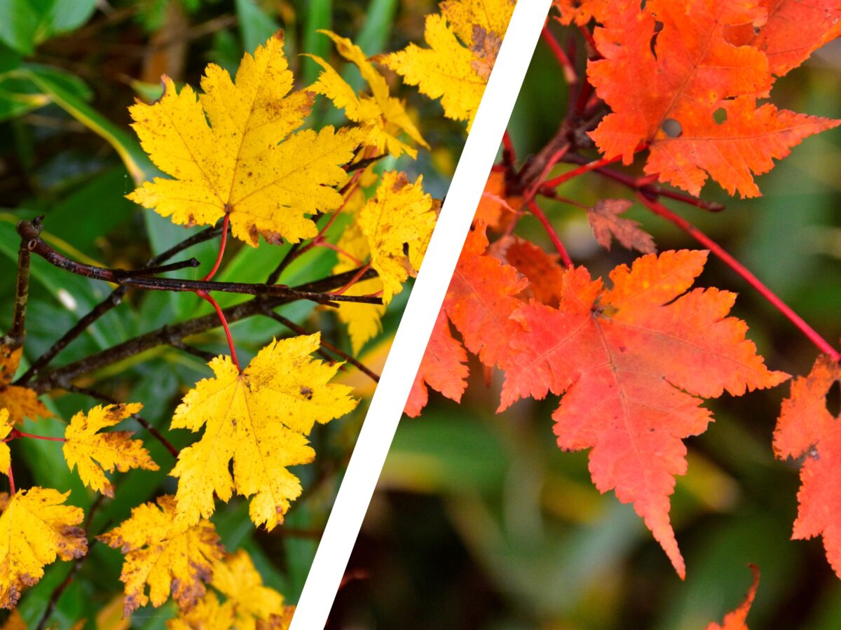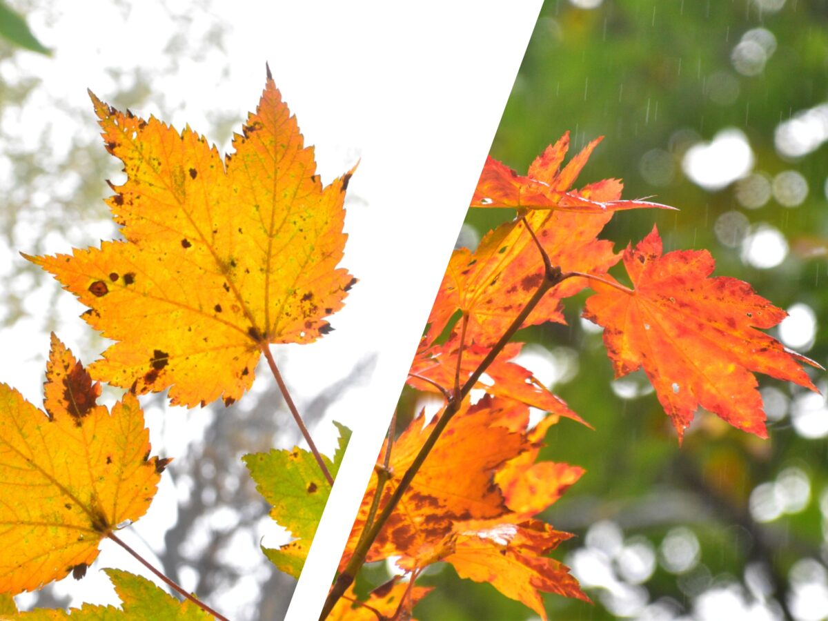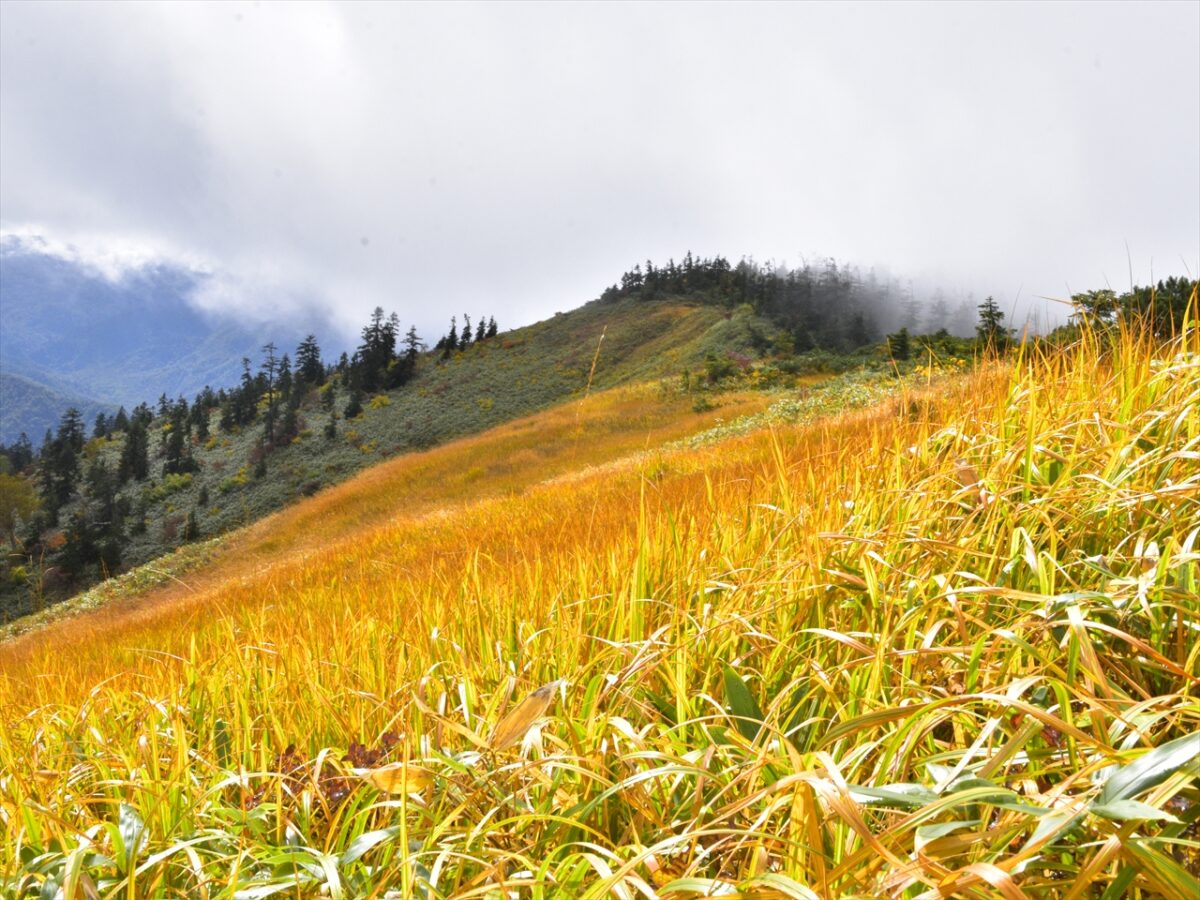稜線ではミネカエデの黄葉が見頃を迎え、斜面を黄色の絨毯のように埋め尽くしています。また、駒の小屋から20分程南にある岩場周辺ではよく似たコミネカエデの紅葉が見頃を迎えていました。この2つのカエデは黄葉と紅葉の違いだけではなく、葉の先端部分があまり伸びないとミネカエデ、よく伸びるとコミネカエデと判別することができます。
